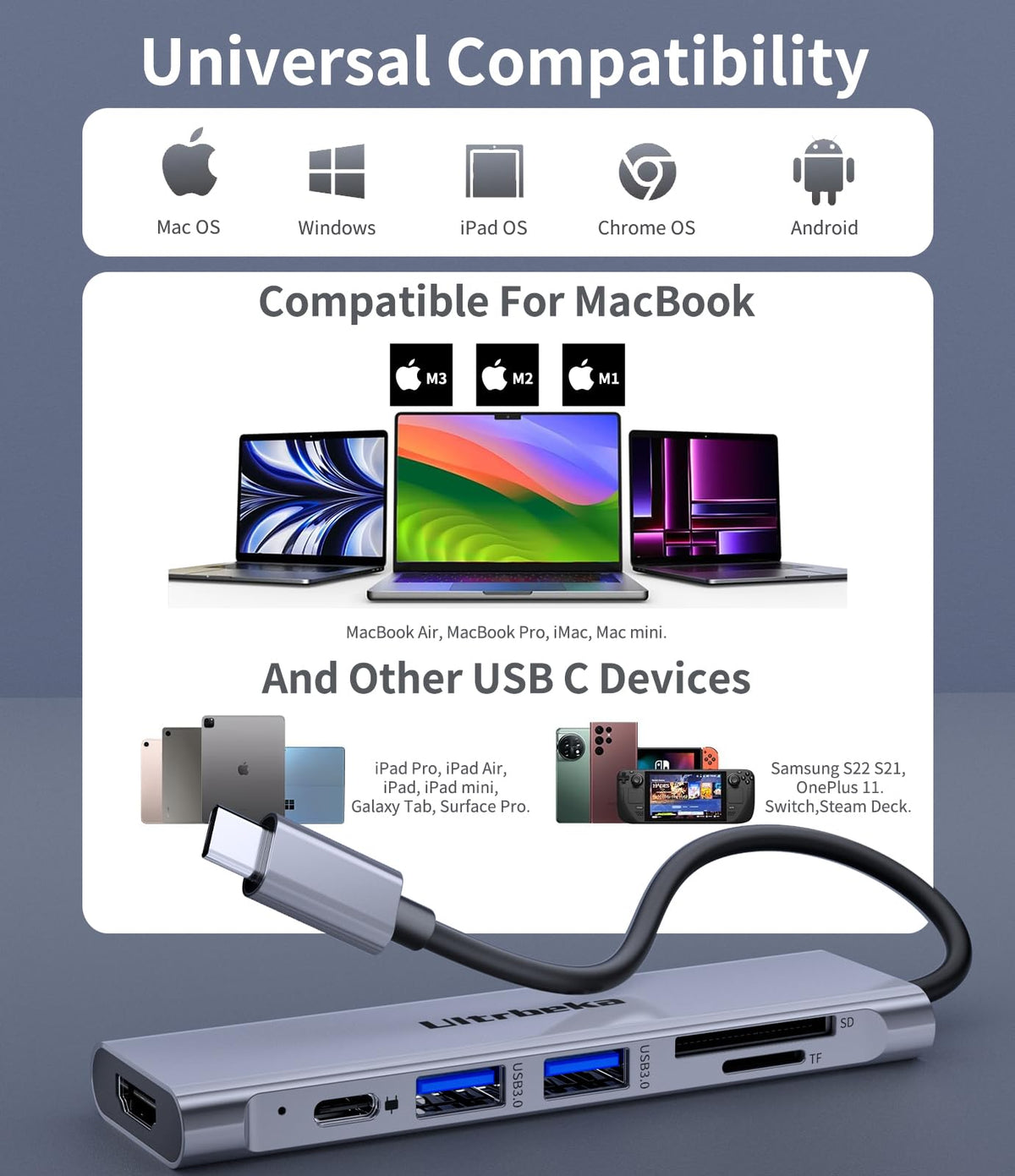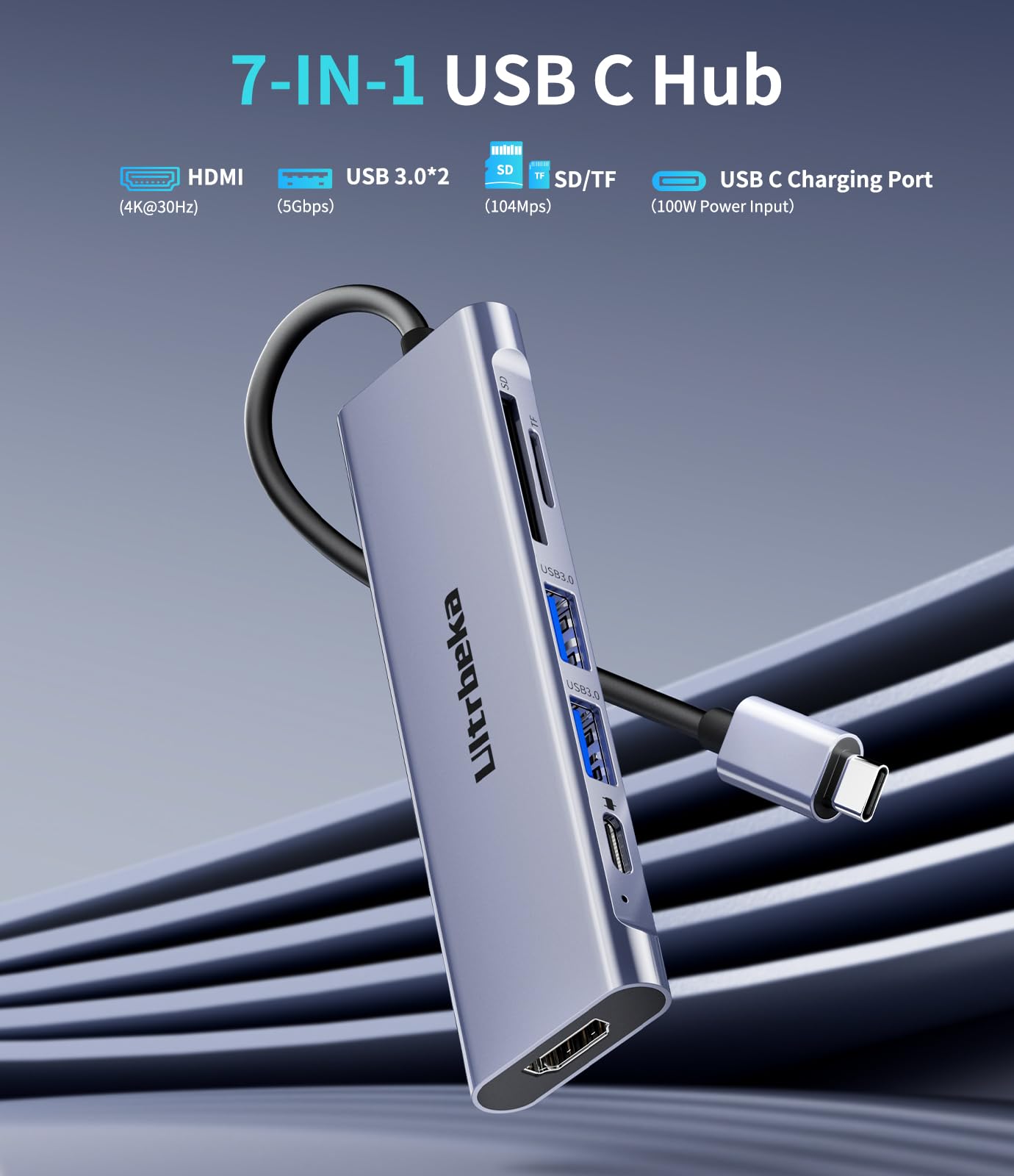 Usb C Hub, 7In1 Usbc Hub, 4K Hdmi Multiport Adapter, Tf/Sd Card Reader, 2 Powered Usb A 3.0 5Gbps, 100W Pd, Dongle Adapter, Usb