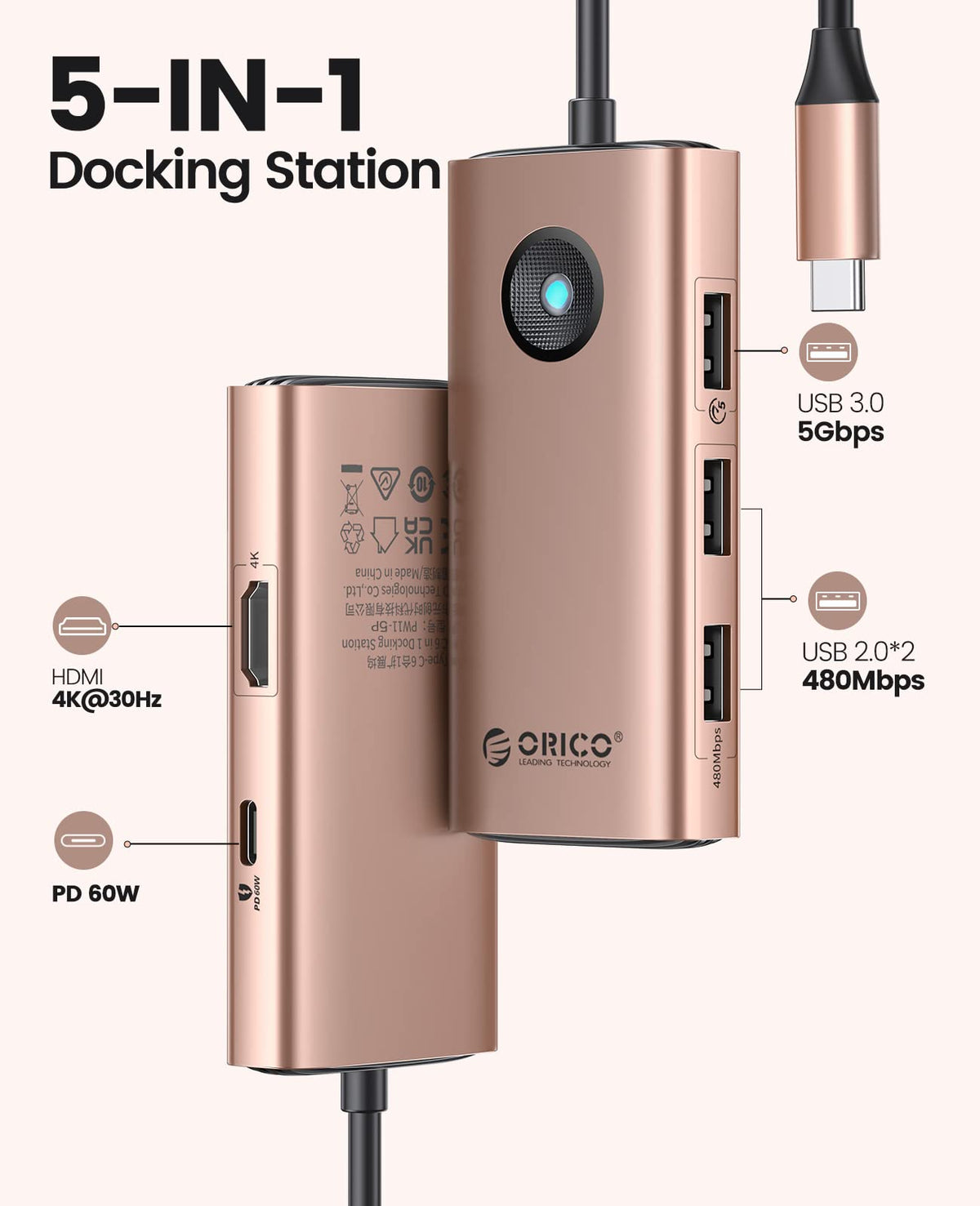 Usb C Hub, Orico 5 In 1 Usb C Docking Station With 4K Hdmi, 60W Power Delivery, Usb 3.0 5 Gbps And 2 Usb 2.0 Data Ports Usb C Do