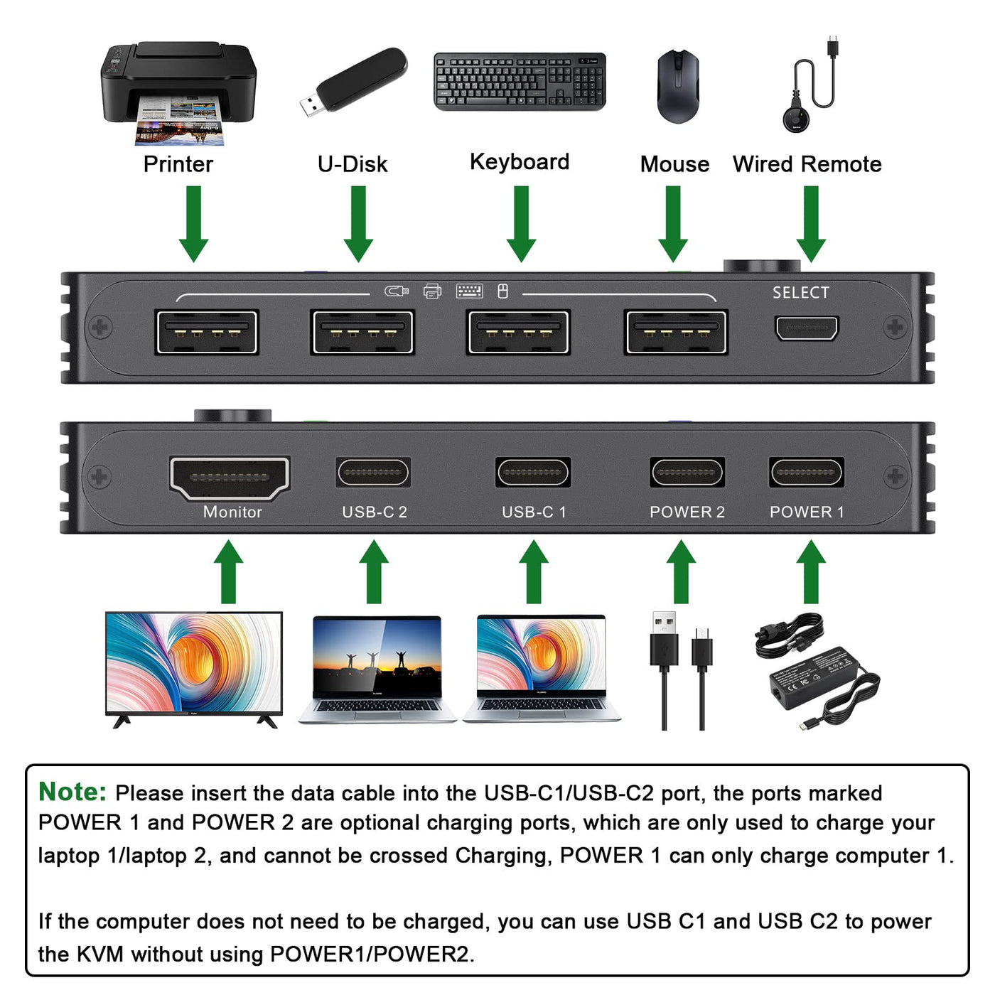 ?2 Ports Usb C Kvm Switch?Usb Type-C Kvm Switch Can Easily Switch Between 2 Usb C Desktops And Laptops, Sharing 1 Set Of Wired/Wireless Keyboard, Mouse, Printer, U Disk And 1 Hd Monitor.2 Type C Input, 1 Hdmi Output. | ?Ultra Hd 4K@60Hz Visual Enjoyment?Usb C Kvm Switches Support Usb Type-C Alternate Mode To Hdmi 2.0 Output With Resolution Up To 4K@60Hz,2K@120Hz, 1440P@100Hz,Make Image Display More Exquisite And Realistic,Color Is More Bright And Moving. Of Course, It Also Support 4K@30Hz,3D And 1080P Or Lower Resolution.If You Need A 4K Resolution,Pls Make Sure Computers/Monitor Support 4K Resolution And Hdmi 2.0 Cable Insert. | ?Charge Your Computer?Fully Compatible With Power Delivery (Pd 3.0) Up To 100 W At 5V, 9V, 15V, 20V, Since The Kvm Requires Power, The Power Output To The Computer Will Not Be As High As The Power Supplied To The Input.The Usb-C Kvm Switcher Contains 4 Usb-C Connections Associated With 2 Ports.Note:Each Power Port Can Only Provide Power To The Associated ''Pc'' Port. | ?Kvm Switcher With 4 Usb Ports?Usb-C Kvm Switch With 4 Usb 2.0 Ports Which Can Recognize Wireless Keyboard,Mouse,Printer,Scaner And Other Usb Devices.Usually The Usb C Kvm Switch Is Powered By The Usb C Cables Connected To The Computer, But When Using High-Power Usb Devices (Such As Hdd, Digital Camera, Ssd, Etc.), An External Power Adapter (Inserted Into The Port Marked:Power1/Power2) Is Required. | ?Great Compatibility & 2 Switching Mode?Mleeda Usb Type C Kvm Switches Driver-Free For Windows 10/8/8.1/7/Xp And Mac Os,Linux,Fully Compatible With Thunderbolt 3.Plug And Play.You Can Press The Button On The Panel Or Use The Wired Remote Controller(Included In The Package) To Switch The Computers.Led Indicate The Active Computer. | ?Note?This Usb Type C Kvm Switch Is Only Suitable For Computers Or Tablets/Phones Capable Of Outputting Video Over Usb Type-C (Alternate Mode),And When Using A Tablet/Mobile Phone, An External Power Supply Is Required To Power The Kvm. | ?Packing List? 1*Kvm Switch Usb C, 2*1.0M*Usb-C Cable, 1*1.5M Hdmi2.0 Cable,1*User Manual.2 Years Warranty, 1 Year Replacement, Lifetime Technical Service.