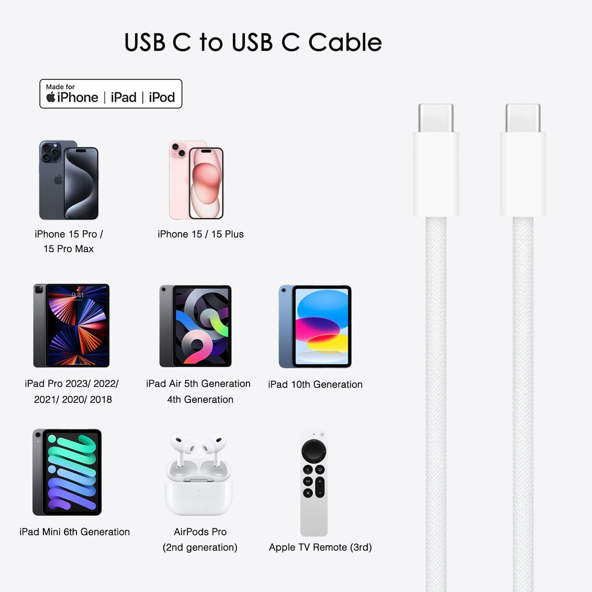 Featuring A White Braided Design That Coils Without Tangling. This 1.5-Meter Cable Supports Phones, Ipads And Headsets With Usb C Port. Fits Latest Generation Of Iphone And Airpods Pro: Iphone 15; V Iphone 15 Plus; V Iphone 15 Pro; V Iphone 15 Pro Max; V Airpods Pro(2Nd Generation); V Ipad Pro 2023/ 2022/ 2021/ 2020/ 2018; V Ipad Air 5Th Gen/ 4Th Gen; V Ipad 10Th Gen; V Ipad Mini 6Th Gen; V 1.5 Meter In Length (5Ft). Usb C To Usb C Woven Cable. You Can Connect To The Usb C Power Adapter For Convenient Charging From A Wall Outlet. Worry-Free 1-Year Warranty, Lifetime Technical Support. *Note: This Cable Is Only Suitable For Usb C Ports And Is Not Suitable For Lightning Ports.