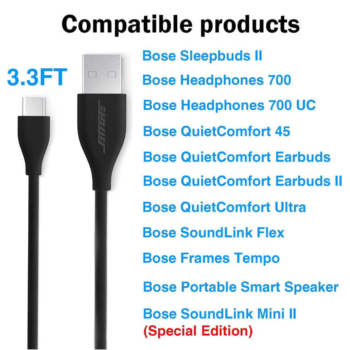 Bose Headset/Speaker Charger Quickly Charge Bose Wireless Bluetooth Devices Without Damaging The Battery Compatibility Bose Noise Headphones 700; Bose 700Anc; Bose Portable Smart Speaker; Bose Sport Earbuds; Bose Sleepbuds 2; Bose Soundlink Flex; Bose Quietcomfort Earbuds; Bose Quietcomfort Earbuds Ii; New Bose Quietcomfort 45 Headphones; Bose Sport Earbuds; New Bose Quietcomfort Ultra Headphones; New Bose Quietcomfort Ultra Earbuds; ???? ( Not For Bose Quietcomfort 35 Qc35Ii, Bose Soundsport Headphones, Bose Quietcomfort 35 Qc35Ii Qc25 Qc20 Soundlink Ii Over-Ear Headphones.) Cable Length: 3.3Feet (39.3In / 1M) What You Get: 1 X Usb Type C Cable; 1 X 5V2A Power Adapter; And If There Are Any Problems With Products, Contact Our Professional And Responsible Customer Service!