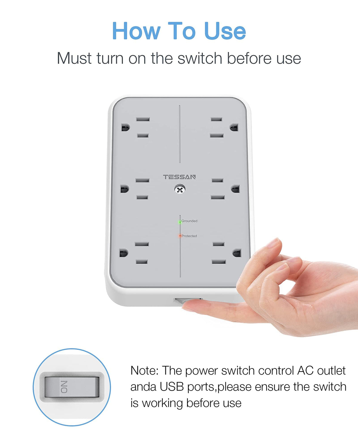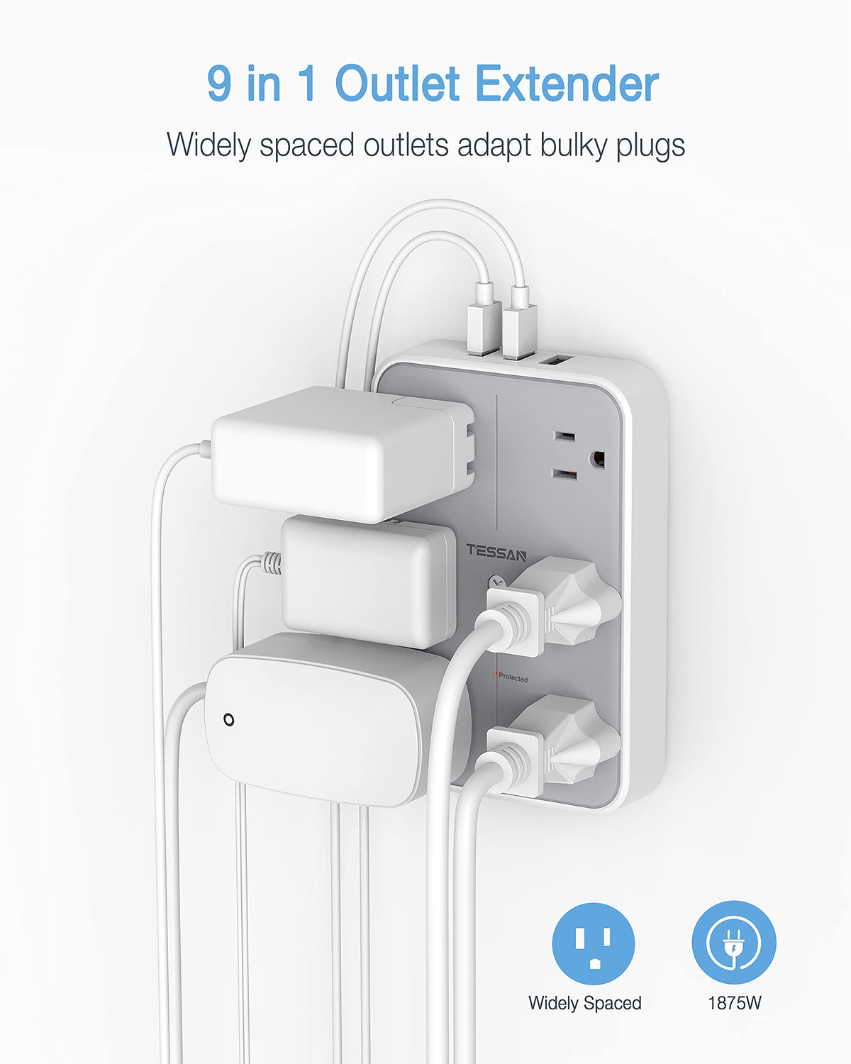 The Usb Plug Outlet Extender Has Enough Ac Outlets And Usb Ports Can Charge Multiple Appliances Such As Laptops, Printers And Scanners. Tessan Wall Surge Protector Has 1080 Joules Surge Protection, Overload Protection Switch, Short Circuit Protection, Protect Your Smart Devices.