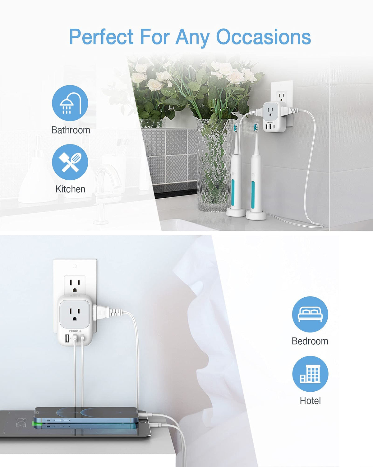 Usb Multi Plug Outlet Extender, Tessan Electrical 4 Outlet Splitter With 3 Usb Wall Charger, Usb Outlet Adapter Cruise Essentials, Home, Office. Tessan Multi Usb Charging Atation Accepts The Standard N American 2 Or 3 Prong Flat Pin Plug. Ac Outlets Are Separated Without Blocking Each Other. 3 Usb Ports Compatible For Charging Your Cell Phone, Tablet And More Devices At Same Time. What'S In The Box: Usb Wall Plug X 1; User Manual X 1