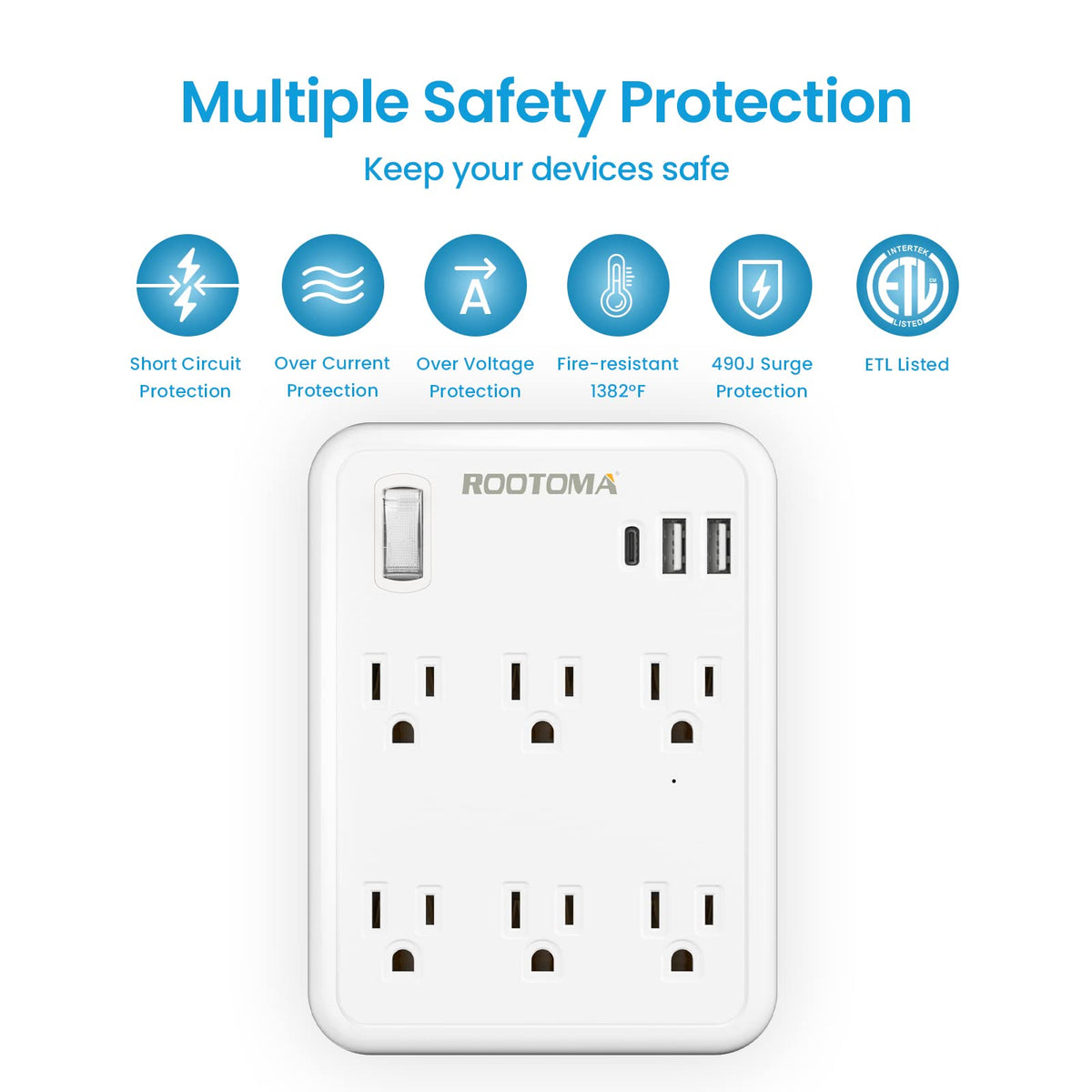 Rootoma Usb Outlet With Switch, Multiple Plug Outlet With 6 Outlets, 3 Usb Ports (1 Usb C), Features 490 Joules Wall Surge Protector, Outlet Adapter For Indoor, Office, Dormitory, White, Etl Listed