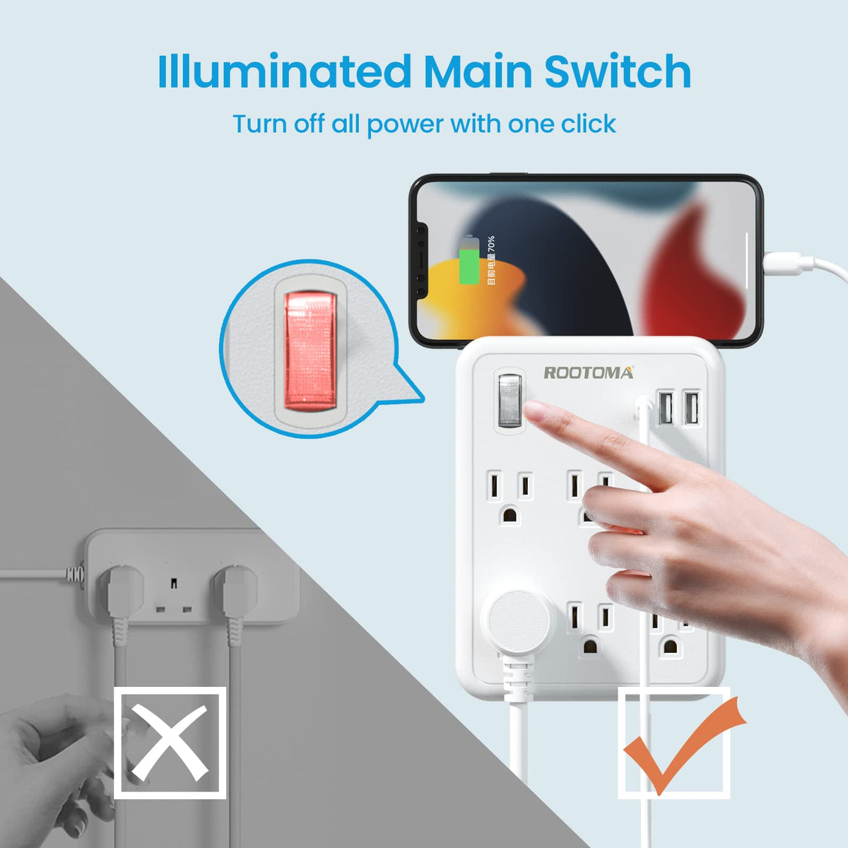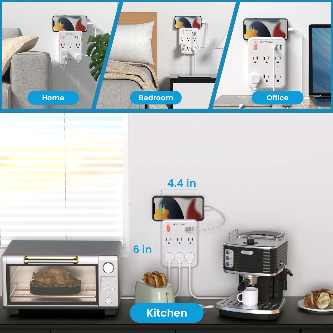 Q: Is this outlet extender safe for indoor use?A: Yes, the ROOTOMA USB wall outlet extender is ETL and FCC certified, meaning it meets strict safety standards. It features a flame-resistant plastic shell, making it safe for indoor use in homes, offices, and dormitories.