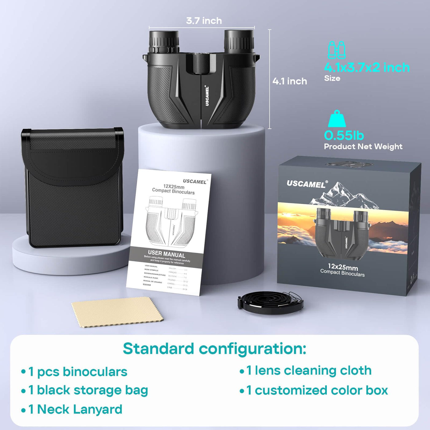 Q: What are the main features of the USCAMEL Compact Binoculars?A: The USCAMEL Compact Binoculars feature 12x magnification, 25mm objective lenses, and a wide field of view of 6.2°, allowing you to see distant objects clearly. They are designed with HD prisms for enhanced imaging quality and come with lightweight and compact dimensions for easy portability.