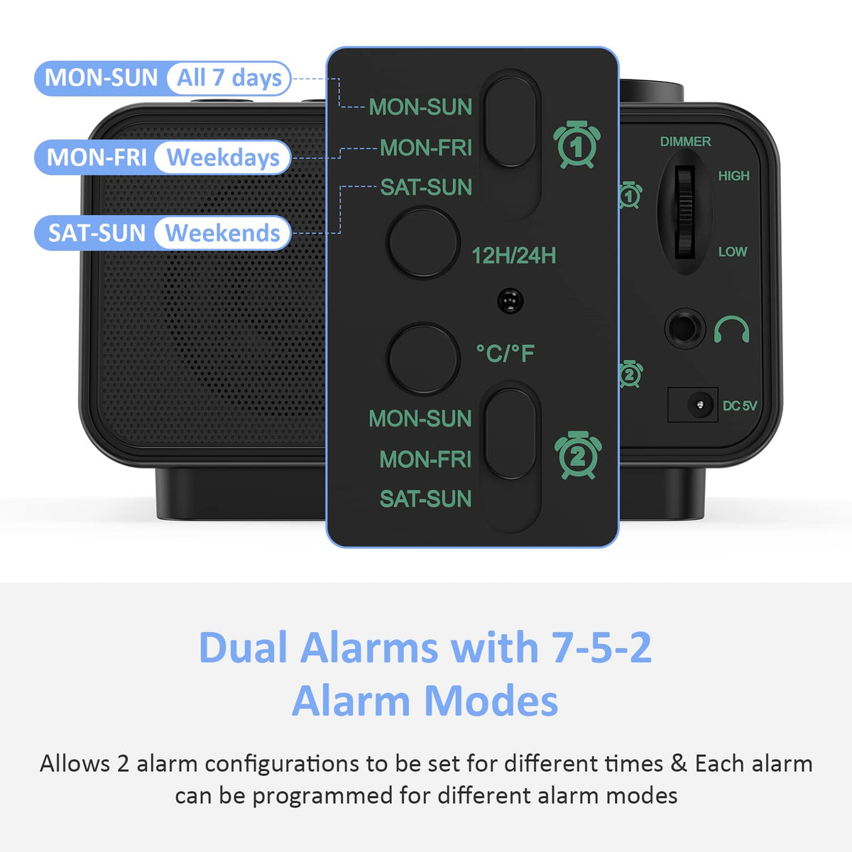 Waking Up Has Never Been So Wonderful With The Uscce Dual Alarm Clock Radio For 3 Weekday Alarm Option, 6 Different Alarm Sounds, Adjustable Alarm Volume, Easy-To-Read 3.4'' Compact Lcd Blue Display, 0-100% Brightness Dimmer, Teperature Display, Headphone Jack, Sleep Timer And Dual Usb Port For Mobile Device Charging. The Stylish And Compact Digital Clock Radio Goes With Any Decor. Perfect For Home, Bedroom, Kitchen, Hotel, Office, Nightstand, Table, Desk, Shelf, Guess Room, Tv Room, Dorms. Dual Alarm With 6 Optional Alarm Sounds Get Two Alarms In One Clock. The Dual Alarm Feature Is Ideal For Couples With Different Wake Up Times. The 2 Alarms Clearly Say ''Off'' Or Show The Time Making It Easy To Tell Which Alarms Are Active. Wake Up To Radio Or 5 Optional Nature Sounds(Beep/Piano/Buzzer/Bird/Soft Music) And Set Your Comfortable Alarm Volume From 1-15 Level. The Alarm Ring Tone Increases Its Volume Gradually As It Starts Softly But Gets Louder For Whose Who Sleep Like A Rock. 3 Weekday Alarm Option There Are 3 Optional Wake-Up Dates To Choose From Here: Weekdays, Weekends And Every Day. This Is A Perfect Selection For Students Who Want To Wake Up On Weekdays And Sleep During The Weekends. Fm Raido With Sleep Timer The Digital Fm Radio Allows You To Wake Up To The Radio ( Or The 5 Optional Nature Sounds), And A 15-150 Minute Sleep To Music Timer Makes You Easily Fall Asleep To Your Favorite Station. 0-100% Adjustable Dimmer The Brightness Of Blue Digits Can Be Set To Any Level From Bright To Very Dim (Or Even Completely Off) By Turning An Adjustment Wheel In Back, Have It Bright In The Day Then Dim Them Down At Night. You Will Never Worry Too Bright At Night. Package Included1*Uscce Radio Alarm Clock1*Power Adaptor(4.9Ft)1*User Manual
