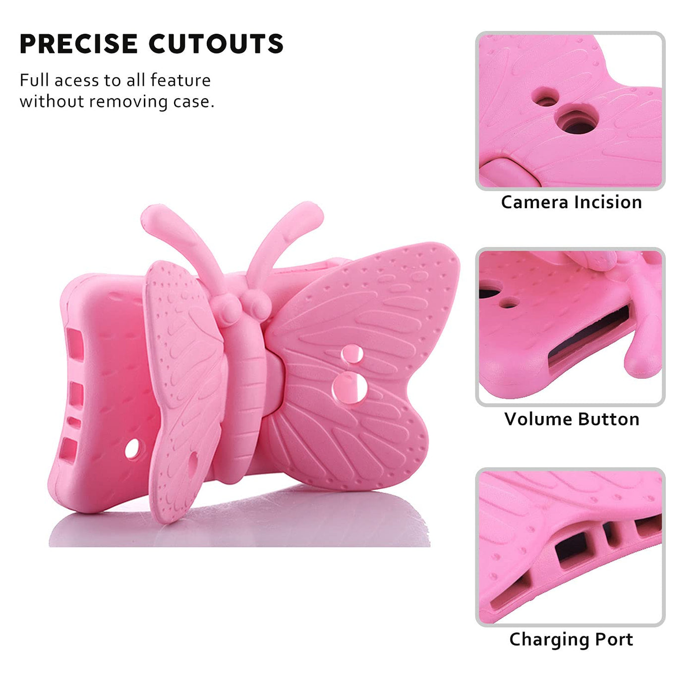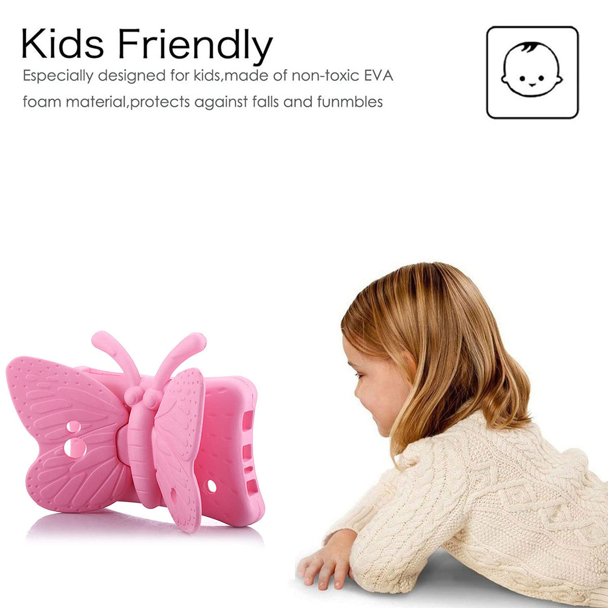 Q: How does the kickstand work on this tablet case?A: The case features two built-in folding butterfly wings that act as a kickstand, allowing your tablet to stand upright for hands-free viewing or typing. This design ensures that your child can enjoy videos or games comfortably.