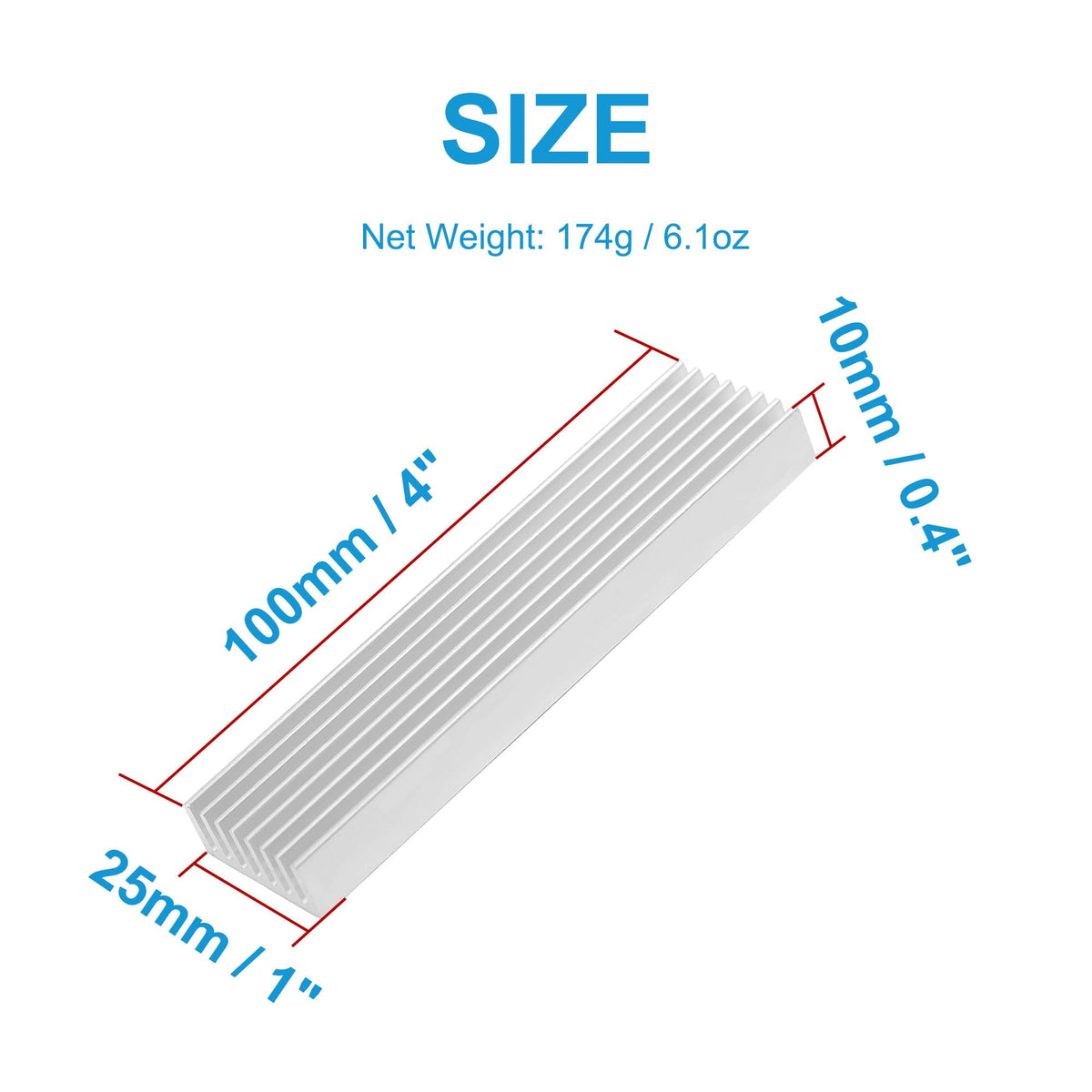 Q: What are the dimensions of the uxcell Aluminum Heat Sink?A: The dimensions of the uxcell Aluminum Heat Sink are 100x25x10mm, or 4 x 1 x 0.4 inches (L*W*H), making it compact and suitable for various electronic applications.