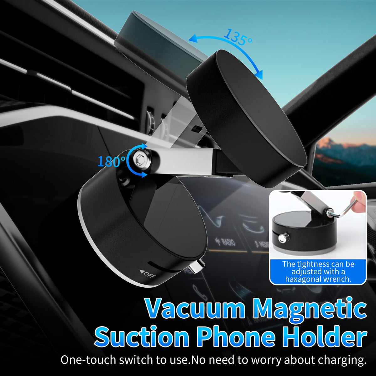 Upgraded Vacuum Suction Magnetic Phone Holder, Adjustable Vacuum Magnetic Car Phone Holder, Foldable And Retractable Vacuum Magnetic Cell Phone Holder Stand Suction Phone Mount For Iphone 16/15/14/13/12/Gym/Car/Mirror Specification: Name: Vacuum Suction Cup Magnetic Phone Mount Color: Black Materials: Abs+Pc Size: 5.9Cm * 5.9Cm * 4.3Cm (2.32In * 2.32In * 1.69In) Weight: 100G Magnetic Adsorption Force: 3.31Lb Key Features & Benefits: Vacuum Magnetic Suction Technology: Combines A Vacuum-Sealed Suction Cup For Surface Adhesion With A Magnetic Interface For Phone Attachment. Ensures Secure Hold On Smooth Surfaces (Car Dashboards, Gym Mirrors) And Easy Phone Mounting/Dismounting. Multi-Surface Versatility: Works In Cars, Gyms (Mirrors/Equipment), And On Any Smooth Surface. Suction Cup Designed For Temperature Resilience (Withstands Car Heat/Cold) And Vibration Resistance. Foldable & Retractable Structure: Compact Storage And Portability. Telescoping Arms And Collapsible Joints Make It Easy To Stow In Bags Or Glove Compartments. Widely Compatible: Our Vacuum Suction Cell Phone Holder Mount Are Designed To Fit Most Smartphones. Compatible With Iphone 16 15 14 13 12 Pro Max Plus Mini Series. Other Non-Magnetic Mobile Phones Can Be Equipped With Mag-Safe Phone Case, Or Using Our Equipped Metal Ring Glued To The Back Of The Phone. How To Use: 1.Simply Rotate The Mechanical Switch Of The Suction Cup Phone Holder To The Right And The Phone Holder Will Be Adsorbed On The Smooth Surface. 2.Rotate The Switch To The Left And The Suction Force Of The Phone Holder Will Be Released, So You Can Remove The Phone Holder Easily. Package Includes: 1 * Vacuum Suction Cup Car Phone Mount 2 * Metal Ring 1 * Cleaning Pack 1 * User Manual 1 * Mirror Sticker 1 * Wrench 12-Month Warranty, And 24-Hour Friendly Customer Service. If You Have Any Questions Or Have Problems With The Products You Received, Please Contact Us In Time.