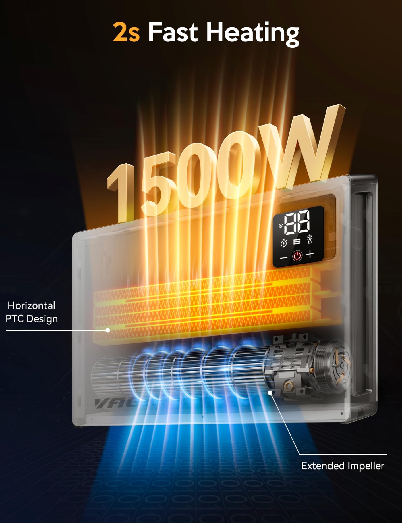 Q: How quickly does the VAGKRI Quiet Electric Space Heater heat up a room?A: The VAGKRI Quiet Electric Space Heater can heat a room to 75°F in just 2 seconds, thanks to its powerful 1500W output, making it an efficient choice for quick warmth.