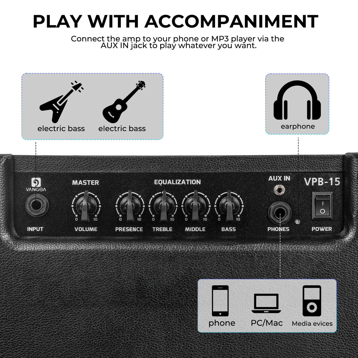 Vangoa Bass Guitar Amplifier 15W Portable Electric Bass Combo Amp Small For Bass Practice Amp Indoor Outdoor, Black