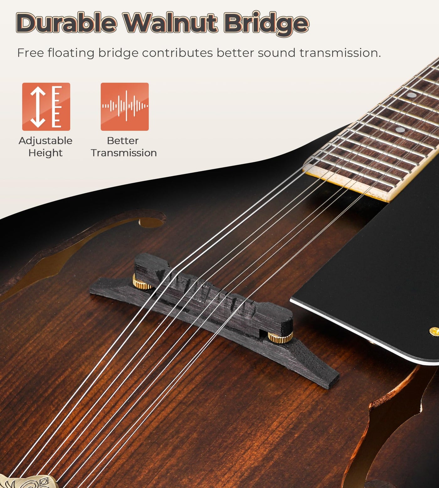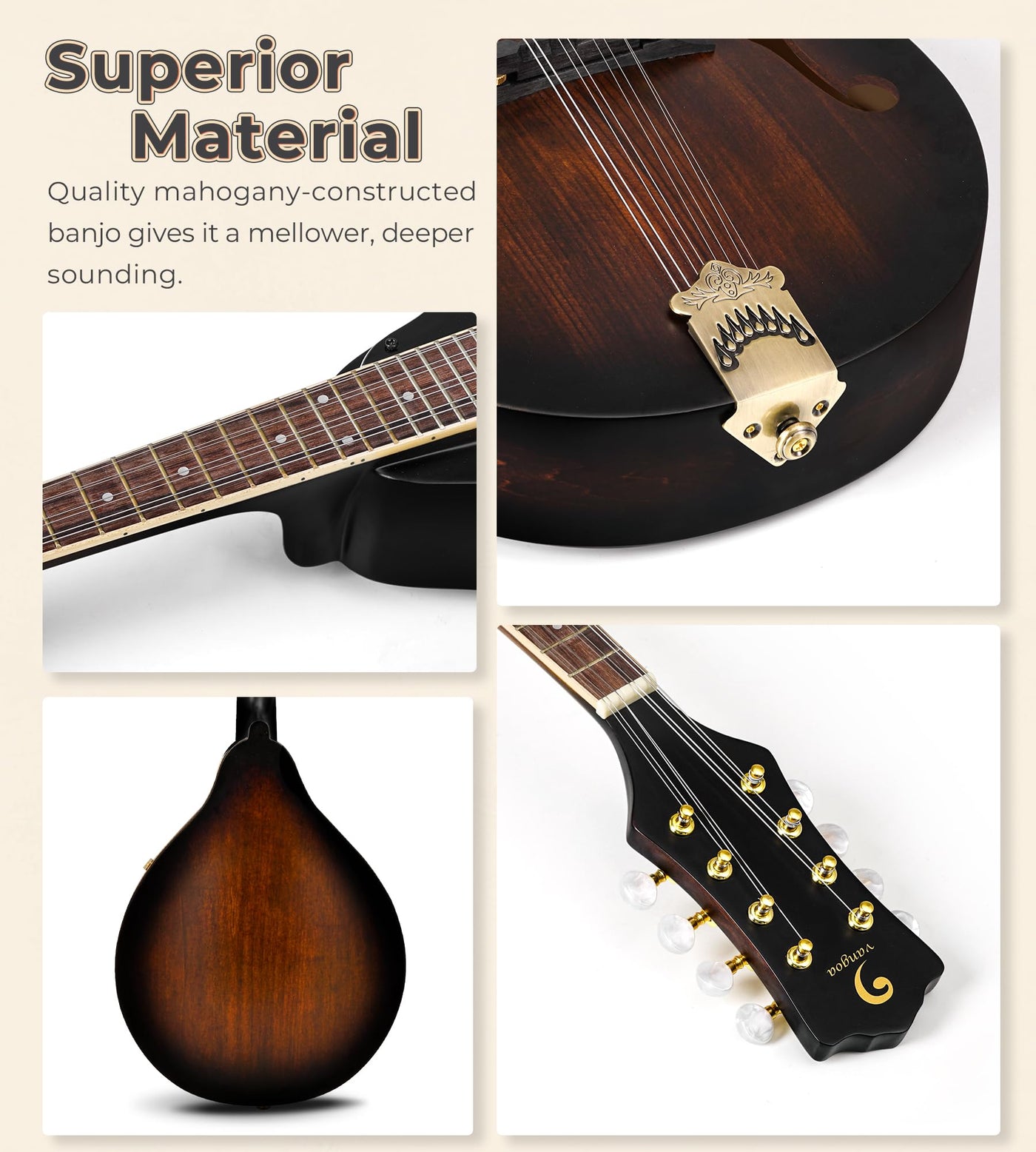 Vangoa Basic Mandolin Instrument Useful Kit For Beginner Specifications: Top&Back: Solid Spruce Top & Basswood Wood Type: Plywood Neck&Bridge: Mahogany Finish?Glossy Number Of Fret: 20 Color: Brown Hand Orientation: Right Material Of Strings: Nickle Steel