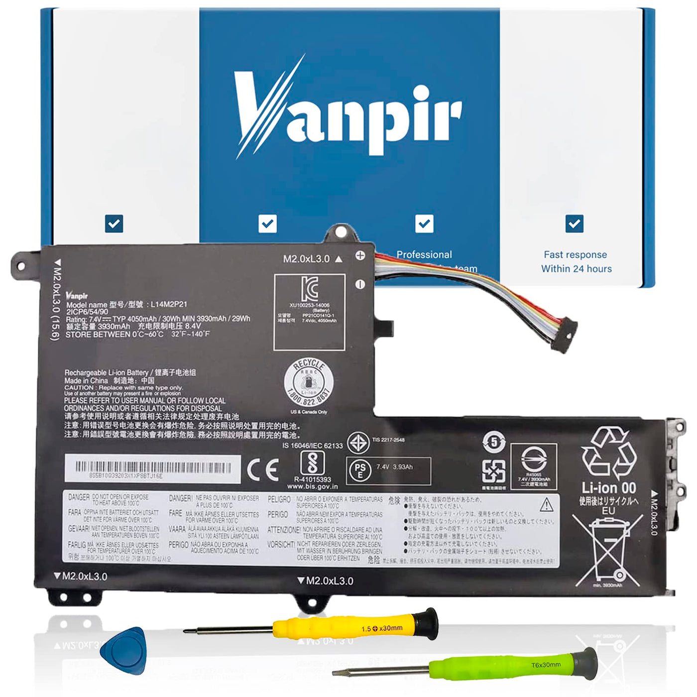 Welcome To Vanpir: We Are A Professional Laptop Battery Manufacturer, Dedicated To Manufacture And Provide High Quality Different Type Laptop Batteries For Our Customer. Specification: Model: L14M2P21 Battery Type: Li-Ion Voltage: 7.4V Capacity: 30Wh 4050Mah Location Of Connector And Cable Length: Please Refer To The Battery Picture And Compare With Your Original Battery Replacement Part Number: L14M2P21 5B10Q39203 5B10Q39204 L14L2P21 5B10Q39206 5B10W67199 L15M3Pb0 5B10Q39202 L15L3Pb0 5B10Q39201 L15C3Pb1 5B10Q39205 Compatible Models: (Use ''Ctrl+F To Find Your Model Quickly'') Fit For Ideapad 330S-14Ast 330S-14Ikb 330S-15Arr 330S-15Ast 330S-15Ikb Gtx1050 Series Note: For More Accurate, Please Check The Part Number Of Your Original Battery Packing Included: 1* L14M2P21 Battery 1* Instruction Manual Use Skills: The New Battery May Not Be Recognized In The First Installation, Please Reinstall And Check If The Battery Is Fully Connected. Discharge The New Battery To 5% (Not 0%), Then Charge And Recycle 3-4 Times To Wake Up The New Battery After-Sales Service: ? Support 30 Days Return Or Exchange And 12 Months Warranty ? Any Questions Will Be Answered Within 24 Hours,Serve You Wholeheartedly ? Welcome To Provide Us With Valuable Suggestions, We All Take It Seriously Battery Maintenance Method For Optimal Use: ? When You Get The New Battery, Discharge The Battery To 5% (Not 0%), Then Charge And Cycle 3-4 Times To Wake Up The New Battery ? The Important Point Is To Perform A Full Discharge And Charge Every Other Month To Extend The Battery Life ? Do Not Connect Adapter For A Long Time While Using The Battery. It May Damage The Battery ? Avoid Artificial Shocks, Disassembly, Crush Or Puncture. Do Not Dispose Of It In Fire Or Water