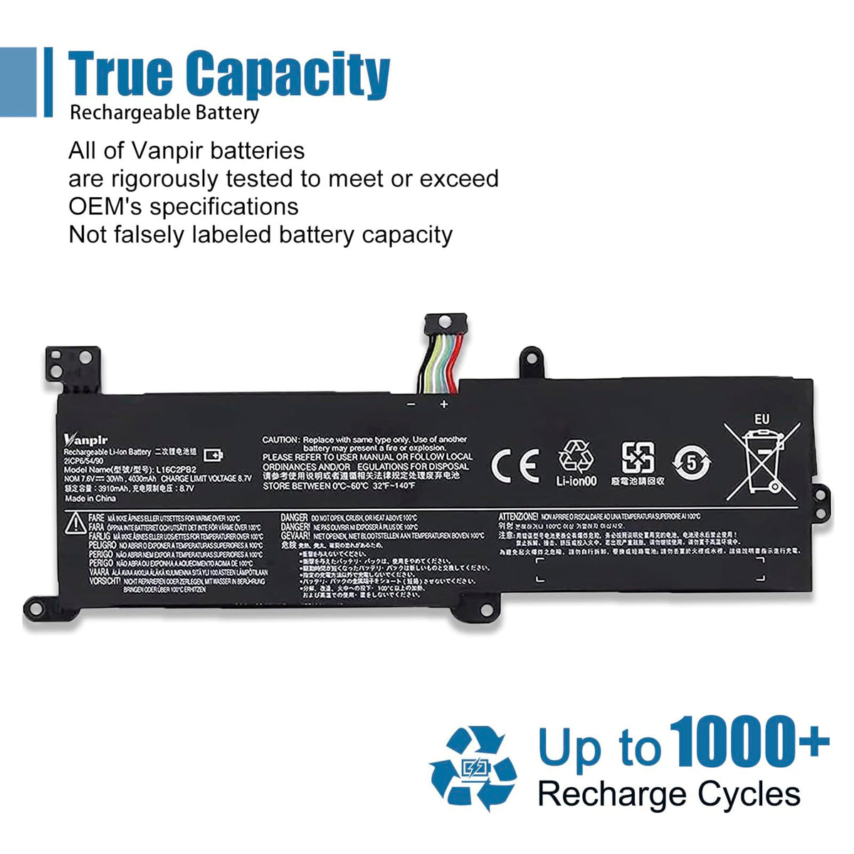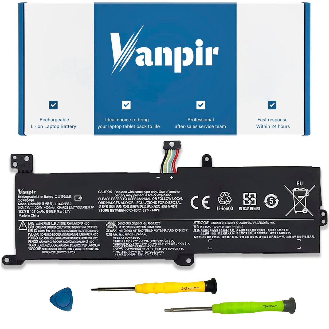 Q: What are the specifications of the VANPIR L16C2PB2 battery?A: The VANPIR L16C2PB2 battery specifications include a battery type of Li-ion, a voltage of 7.6V, and a capacity of 30Wh (4030mAh). These specifications ensure reliable performance and compatibility with various laptop models.
