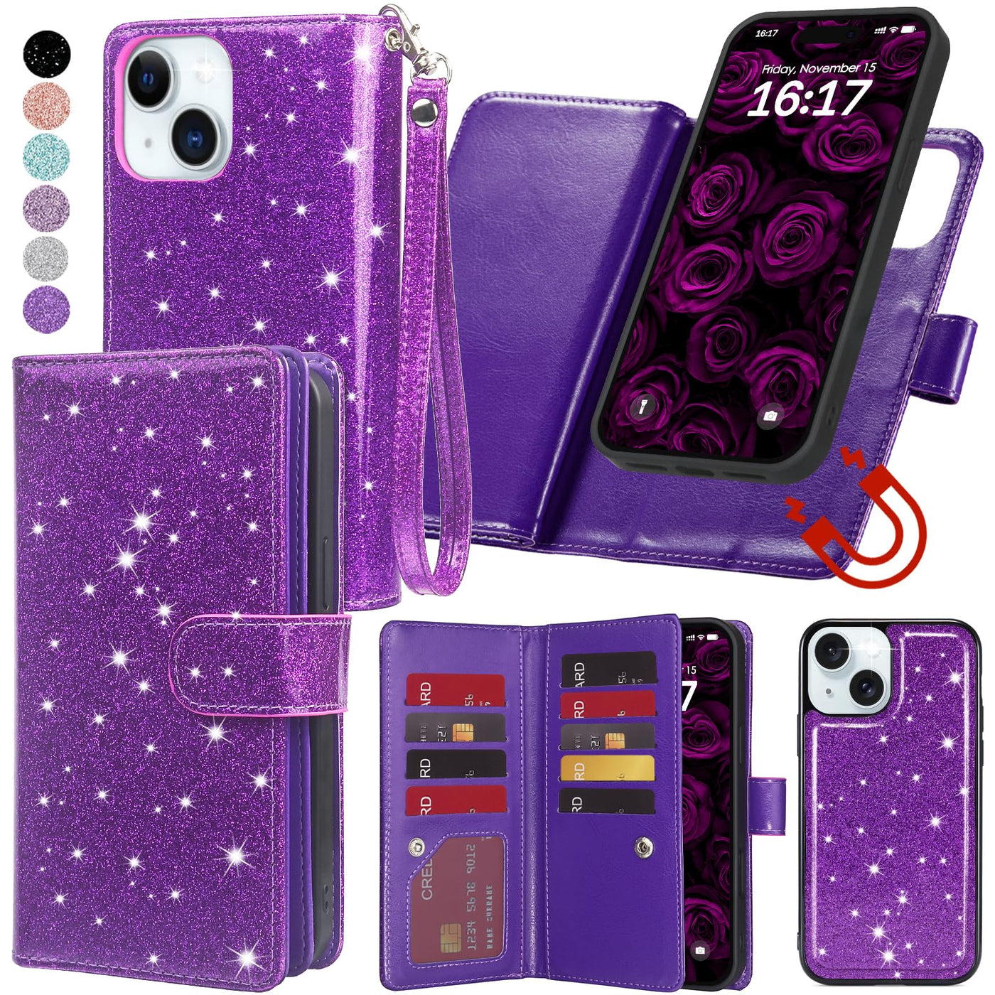 Varikke For Iphone 14 Case Wallet, Iphone 14 Wallet Case For Women With Card Holder & Powerful Magnetic Detachable Case & Kickstand Strap Glitter Pu Leather Phone Cases For Iphone 14 61 Inch]