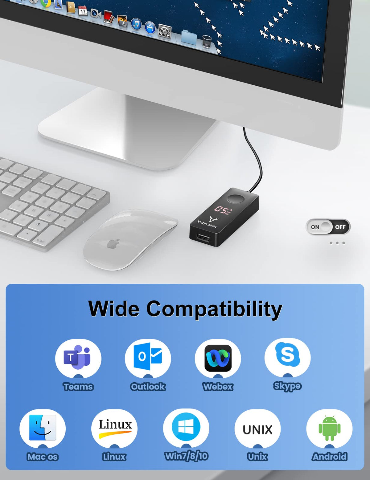 Q: What operating systems and software does the Vaydeer Mouse Mover support?A: The Vaydeer Mouse Mover is designed for wide compatibility, supporting popular software applications such as Microsoft Teams, Webex, and Skype, as well as multiple operating systems including Windows, Linux, and Mac OS.