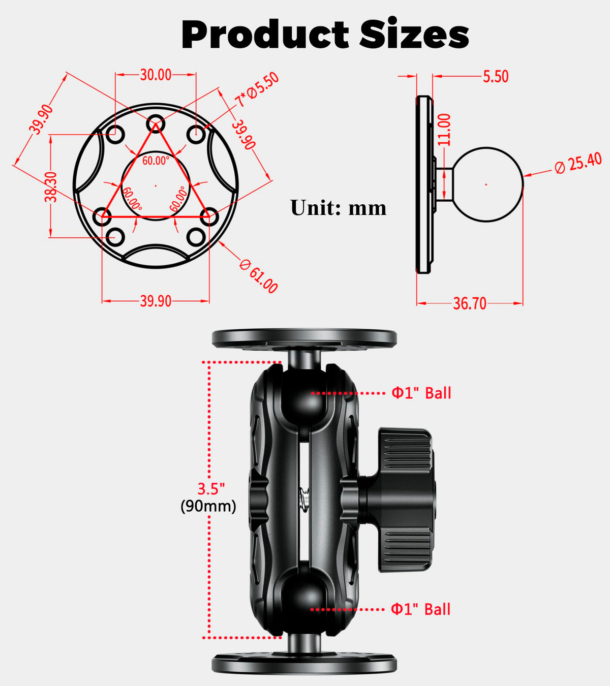 Vazeswin Aluminum Alloy Electronic Device Mount With 1'' Ball Round Plates, 3.5'' Medium Arm Fish Finder Mount Tablet Holder, B