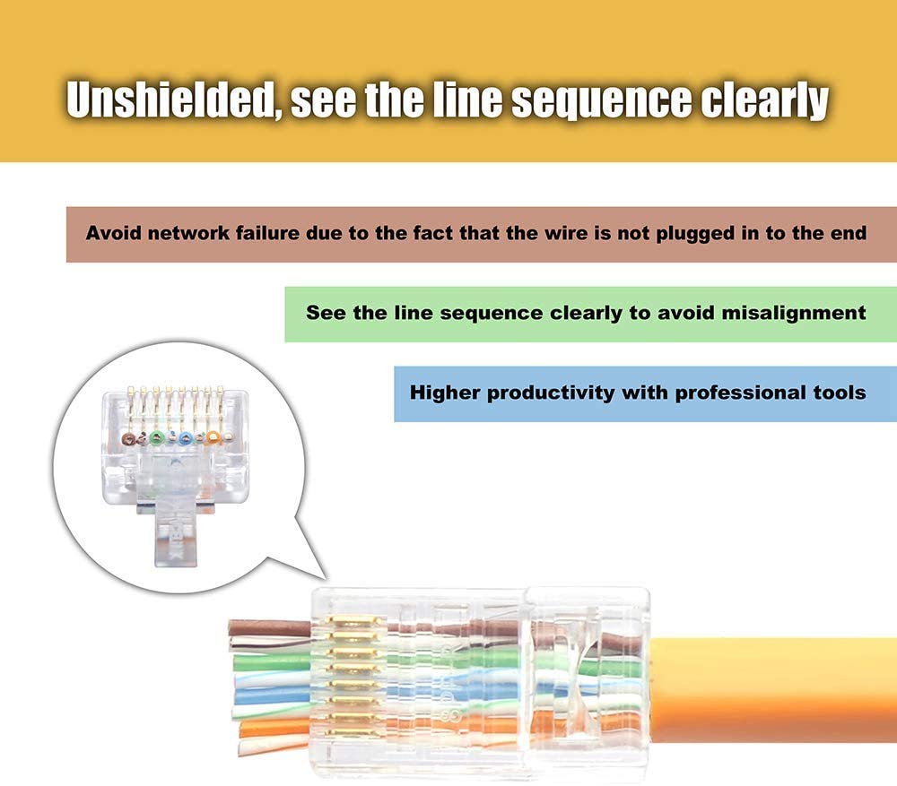 Vcelink Pass Through 8P8C Cat6 Gold Plated Ethernet Connectors Are Designed For For Fast, Reliable Connector Installations For Category 5E Networks.Diy Rj45 Cable Connector Termination Solution For Making Custom Length Ethernet Patch Cords.Transparent Gold Plated Rj45 Plugs Allow You To Identify Wire Sequence, Eliminating Scrap And Improper Crimps.Pass-Thru Design Simplifies Terminations As Wires Are Inserted Through The Connector And Out The Other Side. This Frustration-Free 1-Piece Plug Seats Cable Jackets Tightly For Fast Crimps And Connections. Suitable For Wire Od 0.93 ~ 1.04, Multi-Stranded And Single-Stranded Cables 24Awg .