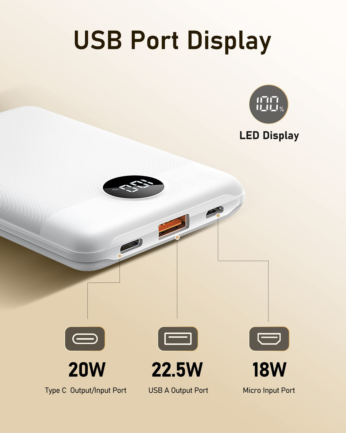 ???Smallest And Lightest 10,000Mah Power Bank?Slim 10,000Mah Power Bank ,10,000Mah 22.5W Pd 3.0 & Qc 3.0 Portable Chargers. Mini Power Bank,Pocket Size And Lightweight | ???Power Bank Fast Charging?Dual Pd 3.0 And Qc 3.0, The Maximum Output Power Can Reach 22.5W, Charging The Device Twice Faster. The Portable Charger Support Passing Through Technology Which Can Charge Your Devices While Recharging | ???Wide Compatibility?Dual Usb-A & Typpe-C Ports Compatible With All The Mobile Devices. Battery Pack Support Low-Current Charging Can Work With Smaller Devices Like Bluetooth Headphones, Airpods, Fitness Trackers, Smart Watches, Etc,A Power Bank Travel Must Haves | ???Led Display?The Intellgence Led Battery Level Indicator Will Show You The Remaining Battery Level And Charging Status | ???Exclusive Technology?Built-In Safeguards Protect Your Devices Against Excessive Current, Overheating, And Overcharging. The Multi-Protection Safety System Ensures Complete Protection For You And Your Devices. ?What You Get?10000Mah Power Bank X1, Type-C Cable X 1, User Manual X 1