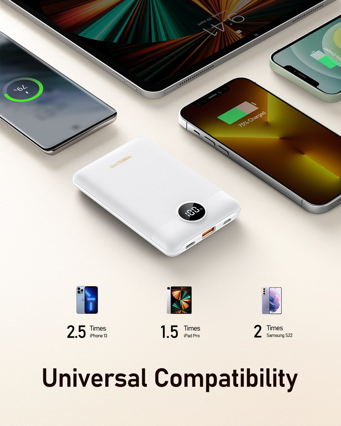 Q: What devices are compatible with the VEEKTOMX Mini Power Bank?A: The VEEKTOMX Mini Power Bank is compatible with a wide range of devices, including smartphones, tablets, and smaller gadgets like Bluetooth headphones, AirPods, fitness trackers, and smartwatches, thanks to its dual USB-A and Type-C ports.
