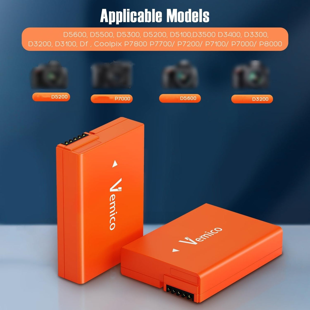 Vemico En-El14&Nbsp;Battery And Charger Provide Enough Power: Two Additional Spare Batteries And Two Chargers Ensure A Perfect Snapshot Without Worries. In Order To Make Sure That You Get The Most Out Of Your Camera Battery, The Backup Batteries Is Necessary. Charge Up A Few Extra Batteries The Night Before. When One Drains, Just Pop In A New One. &Nbsp; Technical Specifications Input: 5V=&Nbsp;1-2A 10W Output: 8.4V=&Nbsp;0.6A 5W Battery: 1500Mah, 7.2V &Nbsp; Compatibility Coolpix P7000 &Nbsp; Coolpix P7100 &Nbsp; Coolpix P7700 &Nbsp; Coolpix P7800 &Nbsp; Coolpix P8000 &Nbsp; P>D3100 &Nbsp; D3200 &Nbsp; D3300 &Nbsp; D3400 &Nbsp;