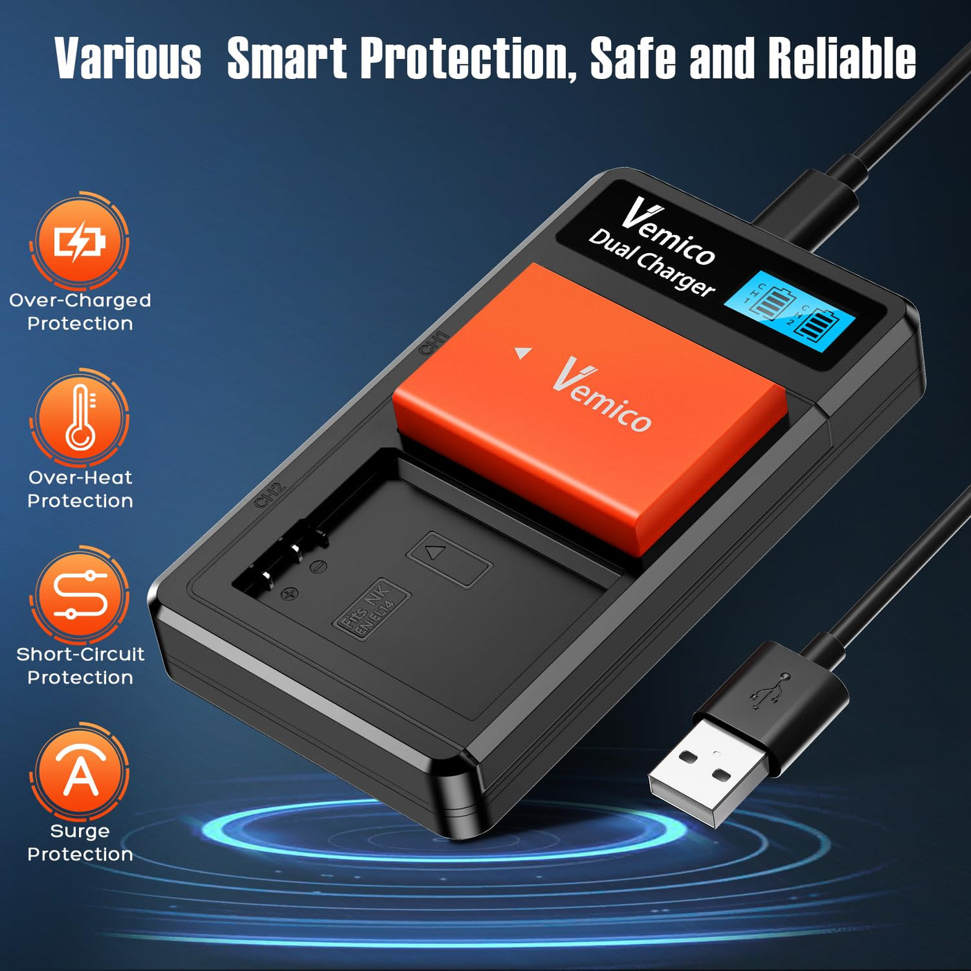 Q: How fast can I charge the Vemico EN-EL14 batteries?A: The Vemico EN-EL14 batteries can be fully charged within 2 hours thanks to the included 5V2A USB-C fast-speed charger cable. This allows for quick charging using various sources, such as a phone charger, power bank, PC, or car socket.