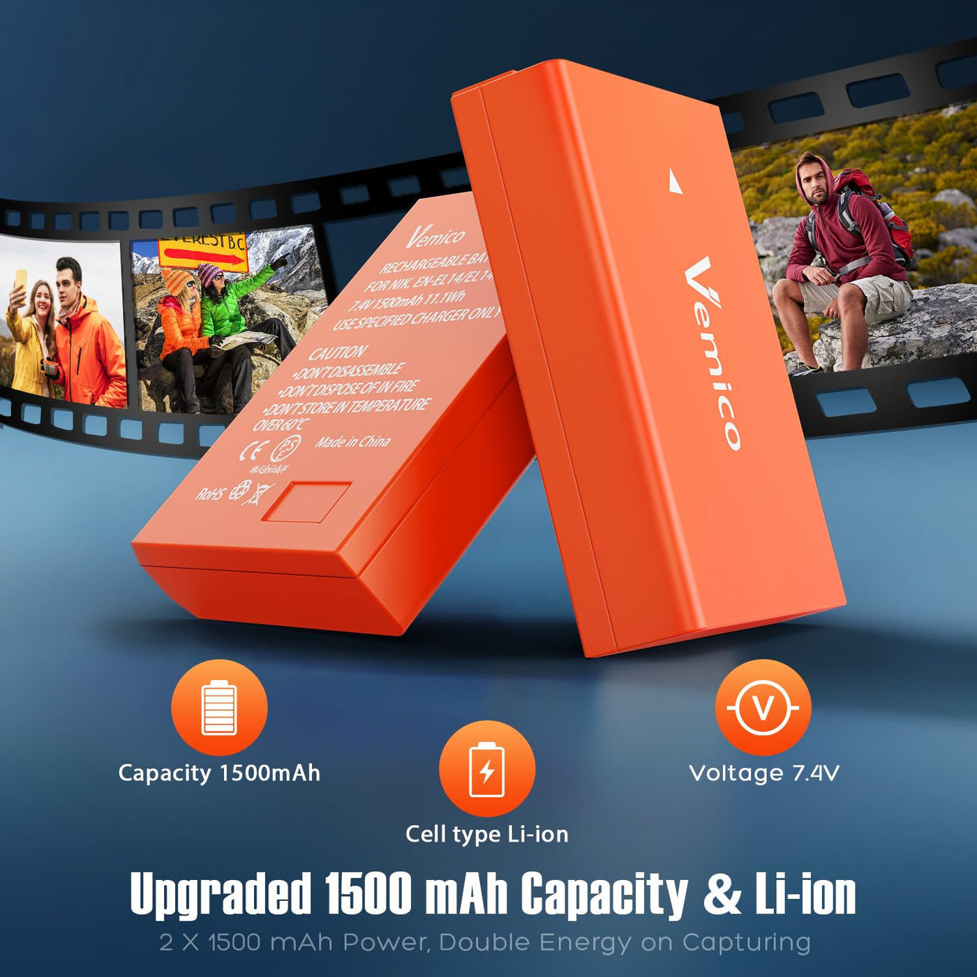 Q: How many batteries are included in the Vemico kit?A: The Vemico EN-EL14 Battery Charger Kit includes two 1500mAh EN-EL14 batteries, providing you with ample power for your camera during extended use, along with the dual-slot charger.