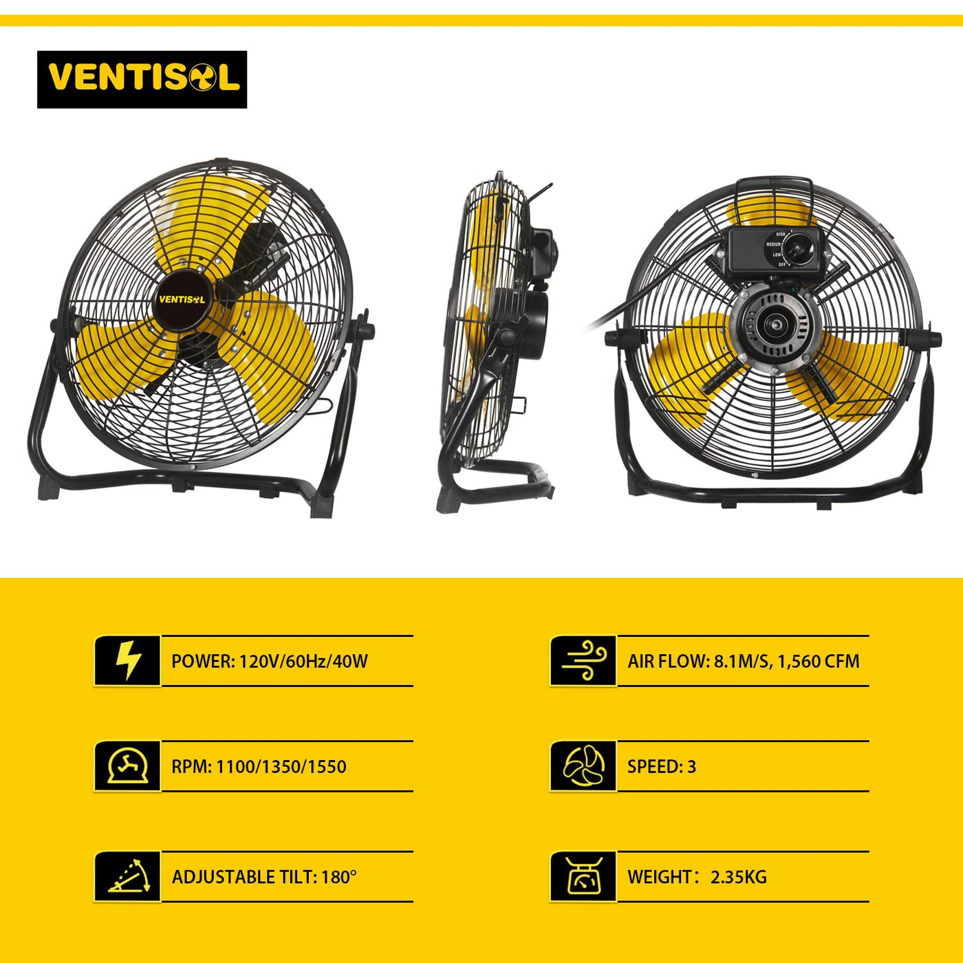 Ventisol 12 Inch 1560 Cfm High Velocity Floor Fan With 3 Powerful Speeds,Portable Metal Construction,180Tilting,Quiet Shop Fan For Commercial, Residential, Gym, Bedroom, Home Use- Etl Listed, Black
