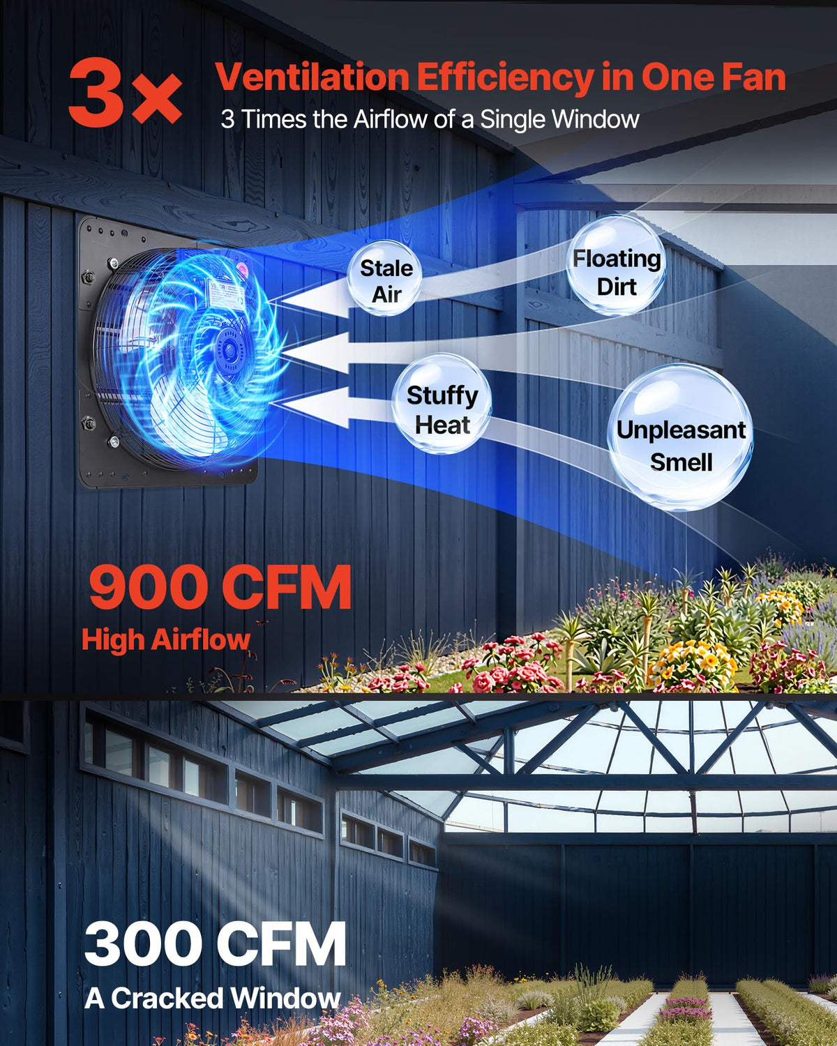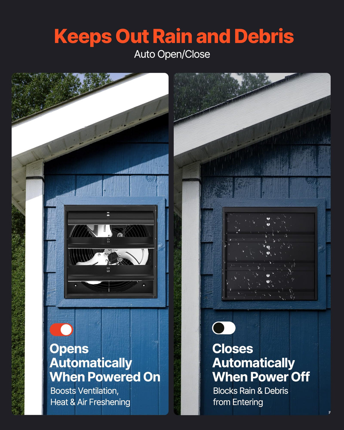 Rapid Venting: This Shutter Exhaust Fan Delivers 900 Cfm To Quickly Expel Stale Air, Floating Dirt, Heat, And Bad Smells, Keeping Indoor Air Fresh. Also Works As A High-Airflow Exhaust Fan For Sheds And Workshops | Smooth Variable Speed: Stepless Variable-Speed Control Puts Airflow At Your Fingertips. The Included Controller Lets You Dial The Exhaust Fan From A Gentle Breeze To A Powerful Blast To Suit Different Ventilation Needs | Premium Ac Motor: 1650 Rpm And 45W Provide Up To 7.4 M/S Airflow While Running Smoothly With Low Noise, Efficient And Stable For A Quiet, Comfortable Experience. Ideal As An Attic Fan For Year-Round Ventilation | Tough Build: All-Metal Steel Construction Offers High Rigidity, Deformation-Resistant, And Handles Damp And Rain, More Sturdy Than Plastic And Ready For Harsh Weather | Rain Guard: Shutters Open When Powered For Ventilation And Deodorizing, Then Close When Off To Block Rain And Small Things, Reliable Protection For An Attic Exhaust Fan Setup