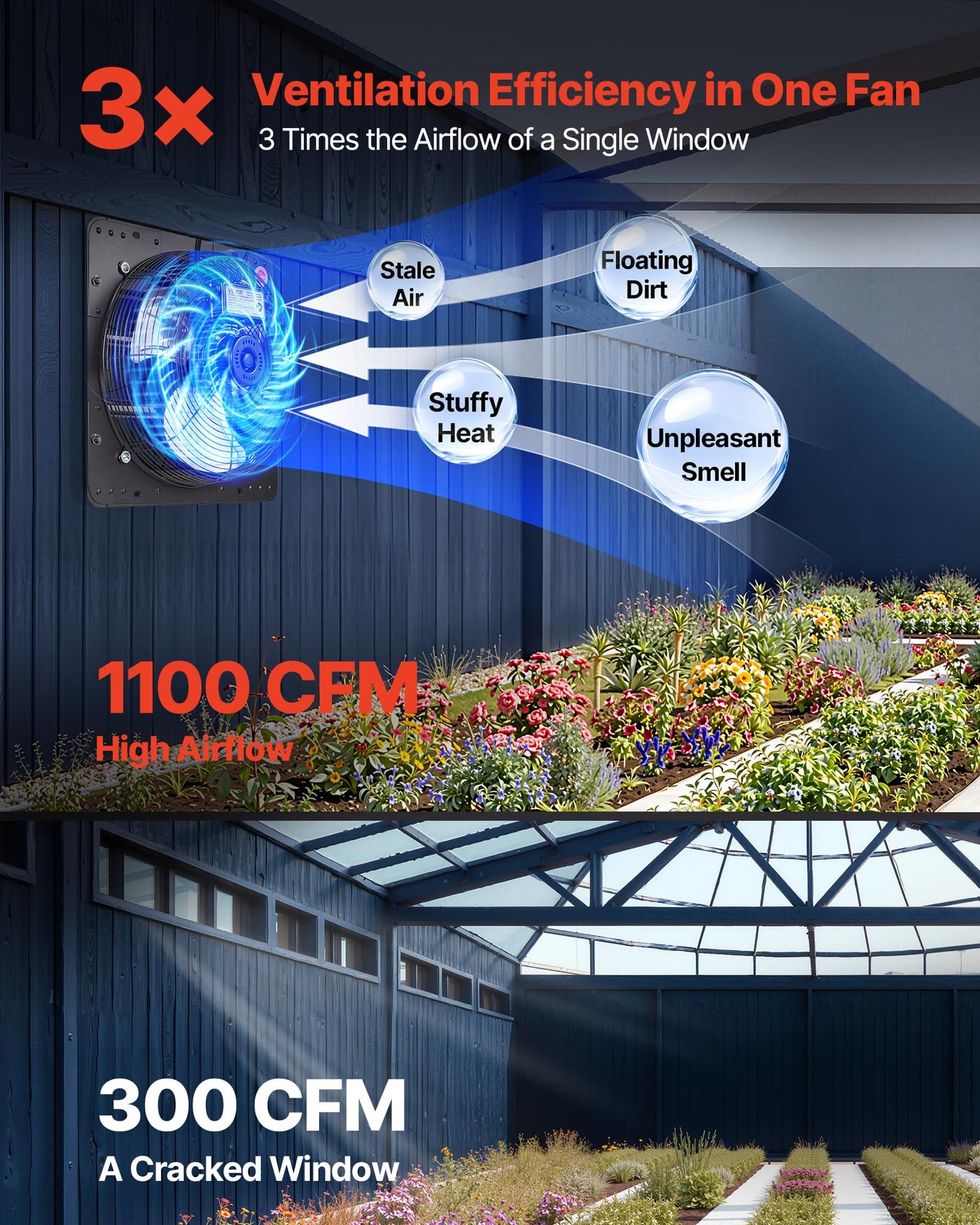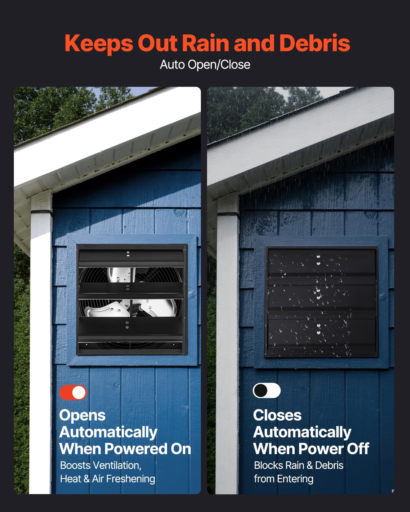 Rapid Venting: This Shutter Exhaust Fan Delivers 1100 Cfm To Quickly Expel Stale Air, Floating Dirt, Heat, And Bad Smells, Keeping Indoor Air Fresh. Also Works As A High-Airflow Exhaust Fan For Sheds And Workshops | Smooth Variable Speed: Stepless Variable-Speed Control Puts Airflow At Your Fingertips. The Included Controller Lets You Dial The Exhaust Fan From A Gentle Breeze To A Powerful Blast To Suit Different Ventilation Needs | Premium Ac Motor: 1600 Rpm And 58W Provide Up To 6.7 M/S Airflow While Running Smoothly With Low Noise, Efficient And Stable For A Quiet, Comfortable Experience. Ideal As An Attic Fan For Year-Round Ventilation | Tough Build: All-Metal Steel Construction Offers High Rigidity, Deformation-Resistant, And Handles Damp And Rain, More Sturdy Than Plastic And Ready For Harsh Weather | Rain Guard: Shutters Open When Powered For Ventilation And Deodorizing, Then Close When Off To Block Rain And Small Things, Reliable Protection For An Attic Exhaust Fan Setup