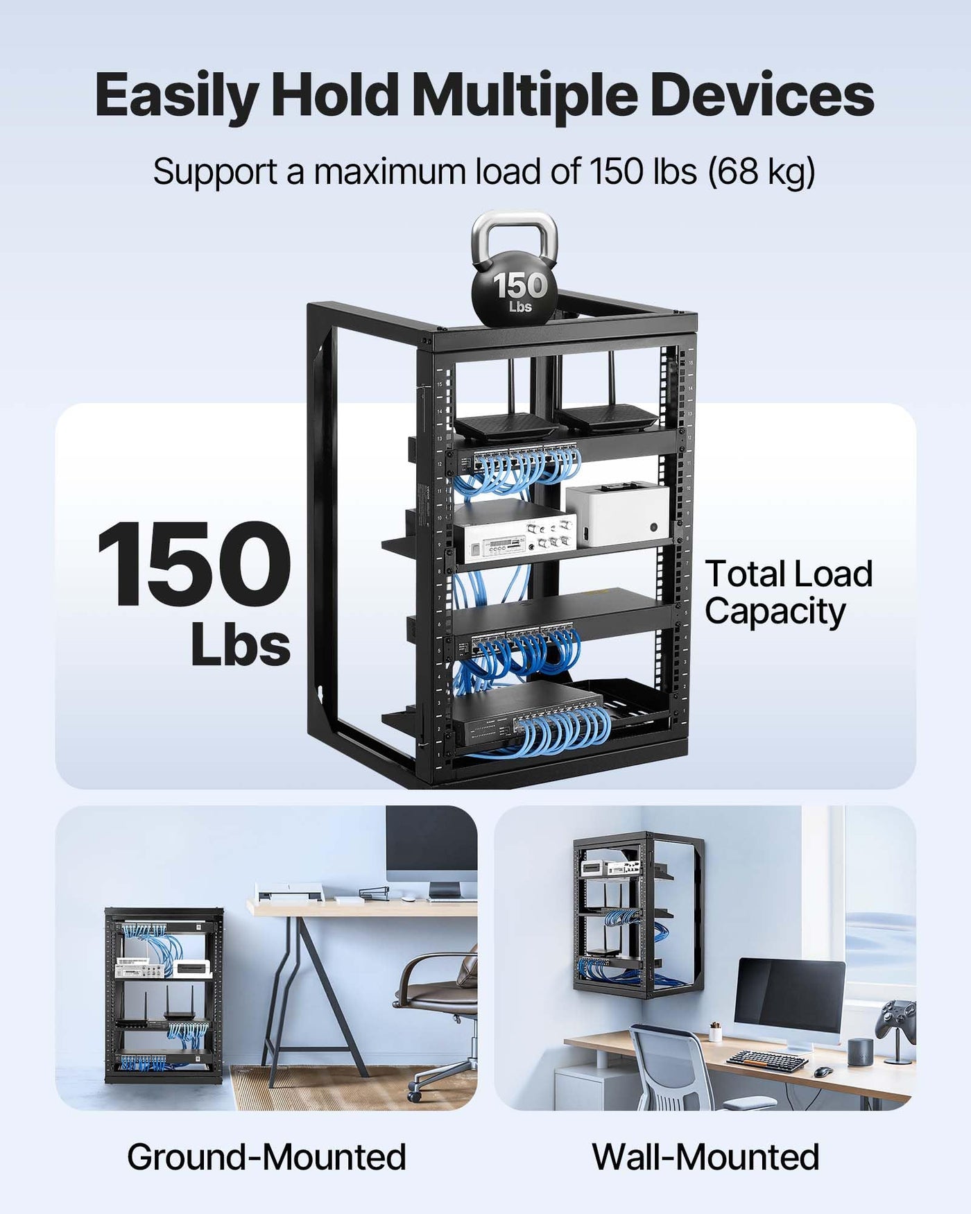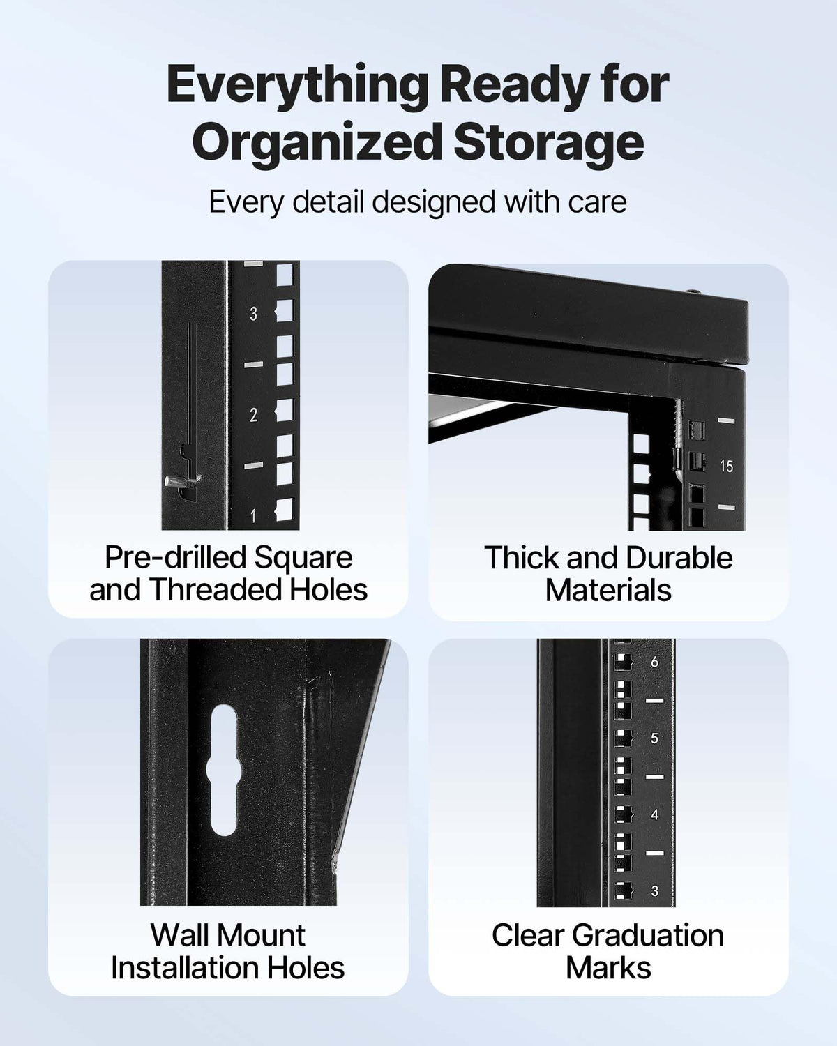 Vevor 15U Open Frame Server Rack, Free Standing Or Wall Mount Rack With 180 Degrees Gate Swing, Network Rack For 19 It Equipment