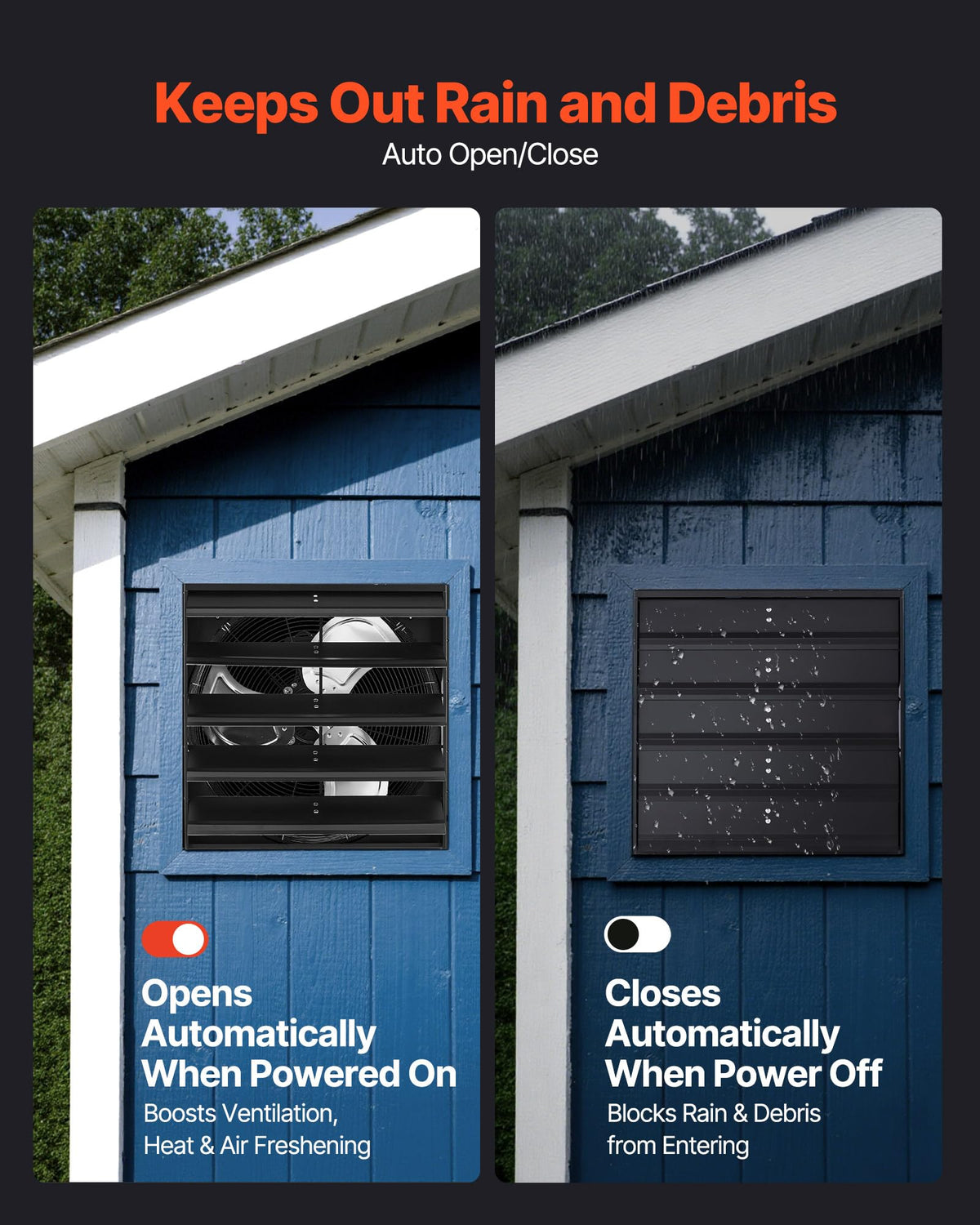 Rapid Venting: This Shutter Exhaust Fan Delivers 3000 Cfm To Quickly Expel Stale Air, Floating Dirt, Heat, And Bad Smells, Keeping Indoor Air Fresh. Also Works As A High-Airflow Exhaust Fan For Sheds And Workshops | Smooth Variable Speed: Stepless Variable-Speed Control Puts Airflow At Your Fingertips. The Included Controller Lets You Dial The Exhaust Fan From A Gentle Breeze To A Powerful Blast To Suit Different Ventilation Needs | Premium Ac Motor: 1480 Rpm And 157W Provide Up To 8.8 M/S Airflow While Running Smoothly With Low Noise, Efficient And Stable For A Quiet, Comfortable Experience. Ideal As An Attic Fan For Year-Round Ventilation | Tough Build: All-Metal Steel Construction Offers High Rigidity, Deformation-Resistant, And Handles Damp And Rain, More Sturdy Than Plastic And Ready For Harsh Weather | Rain Guard: Shutters Open When Powered For Ventilation And Deodorizing, Then Close When Off To Block Rain And Small Things, Reliable Protection For An Attic Exhaust Fan Setup