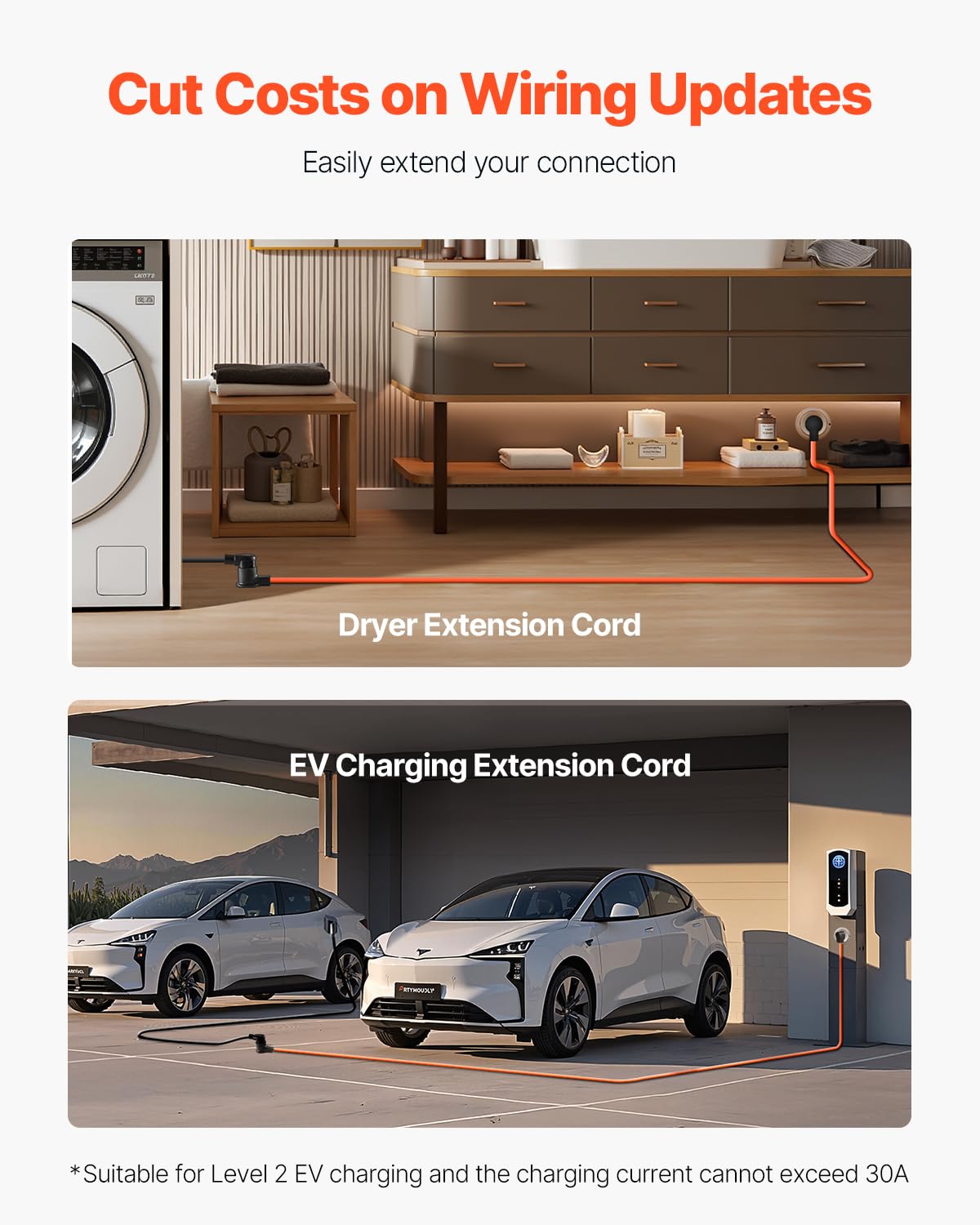 30A Pure Copper Cable: This 10Awg Heavy-Duty Extension Cord, With A Length Of 25 Ft / 7.6 M, Is Rated For 125V/250V And 30A Current, Featuring A 3-Prong Nema 10-30P To Nema 10-30R Plug | Ev Charger Extension Cord: This Dryer Cord Can Serve As An Extension For Your Ev Charger, Suitable For Level 2 Ev Charging, Such As For Tesla Model 3, Model S, Model X, And Model Y (It Is Recommended To Adjust The Charging Current To 30A Or Below) | Weather-Resistant: With Its Stw Insulation Rating, This Dryer Extension Cord Is Built To Withstand Harsh Weather Conditions, Including Rain, Humidity, And Intense Sunlight. Whether Used Outdoors Or To Extend Power Indoors, It Provides Exceptional Durability And Protective Performance | Ideal For Older Dryers: This Is A Classic 3-Prong Design (10-30P), Commonly Found In Buildings Constructed Before 1996. Please Check The Dryer