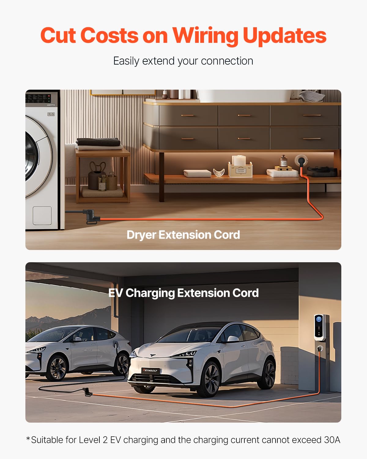 30A Pure Copper Cable: This 10Awg Heavy-Duty Extension Cord, With A Length Of 25 Ft / 7.6 M, Features A 4-Prong Nema 14-30P To Nema 14-30R Plug. Rated For 125V/250V And 30A Current, Its Specifically Designed For High-Power Devices, Extending The Power Source And Providing Stable Power Transmission | Ev Charger Extension Cord: This Dryer Cord Can Serve As An Extension For Your Ev Charger, Compatible With Level 2 Ev Charging, Such As For Tesla Model 3, Model S, Model X, And Model Y (It Is Recommended To Adjust The Charging Current To 30A Or Below) | Weather-Resistant: With Its Stw Insulation Rating, This Extension Cord Is Built To Withstand Harsh Weather Conditions, Including Rain, Humidity, And Intense Sunlight. Whether Used Outdoors Or To Extend Power Indoors, It Provides Exceptional Durability And Protective Performance | User-Friendly Design: The Male End Is Equipped With An Ergonomic Plug Handle, Providing A Comfortable And Secure Grip For Easy Plugging And Unplugging, Reducing Hand Strain During Frequent Use | Convenient Storage: To Help You Keep Things Organized, This Electric Dryer Cord Comes With A Storage Bag And Cable Ties. You Can Easily Store And Transport The Cord Without Worrying About Tangles Or Damage, Keeping Your Space Neat And Tidy