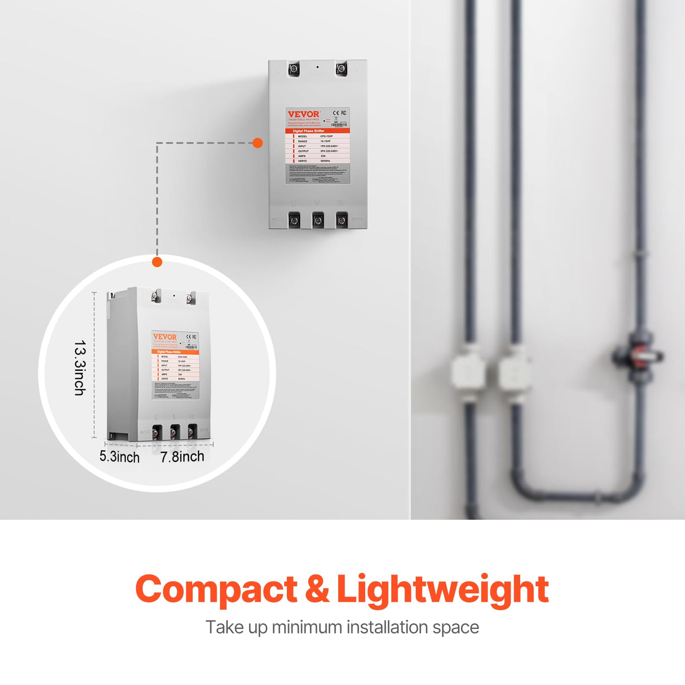 Precise Phase Conversion: Vevor 15Hp Digital Phase Converter Excels In Transforming Single-Phase To 3-Phase Power, Ideal For Operating 220-240V Motor Equipment That Requires A Three-Phase Input. With Compact Size, High Energy Efficiency, And Easy Installation, Its An Optimal Choice For Precision Power Conversion. | Compact And Effortless Installation: With Dimensions Of Just 13.3 X 7.8 X 5.3 And Weighing Only 9.1 Lbs, This Digital Phase Converter Occupies Minimal Space. Its Ideally Suited For Both Residential And Small-Scale Commercial Settings, Offering A Space-Saving Alternative To Bulkier Traditional Inverters. | High Efficiency, Cost Savings: The Vevor 3 Phase Converter Excels In Energy Efficiency, Operating Without High-Frequency Interference And Offering Lower Power Consumption. Long-Term Use Brings Substantial Energy And Operational Cost Savings. | Simple And User-Friendly Setup: Installation Is Straightforward-Simply Connect The Power Supply And Motor Lines. Theres No Need For Complex Programming, Making It User-Friendly. For Added Safety And Reliability, Its Recommended To Use With An Air Switch. | Versatile Applications: Perfectly Suited For High-Powered Motor-Driven Equipment In Residential And Commercial Settings. Whether For Power Tools In A Garage Or Woodworking Machinery In A Small Business, This Phase Converter Provides Stable And Reliable Three-Phase Power, Meeting Diverse Motor Power Requirements. | Power Selection Notes: When The Power Of The Converter Is Several Levels Higher Than The Motor Power, It Will Cause Abnormal Heating Of The Motor. When The Power Is Several Levels Lower Than The Motor Power, It Will Cause Startup Failure.