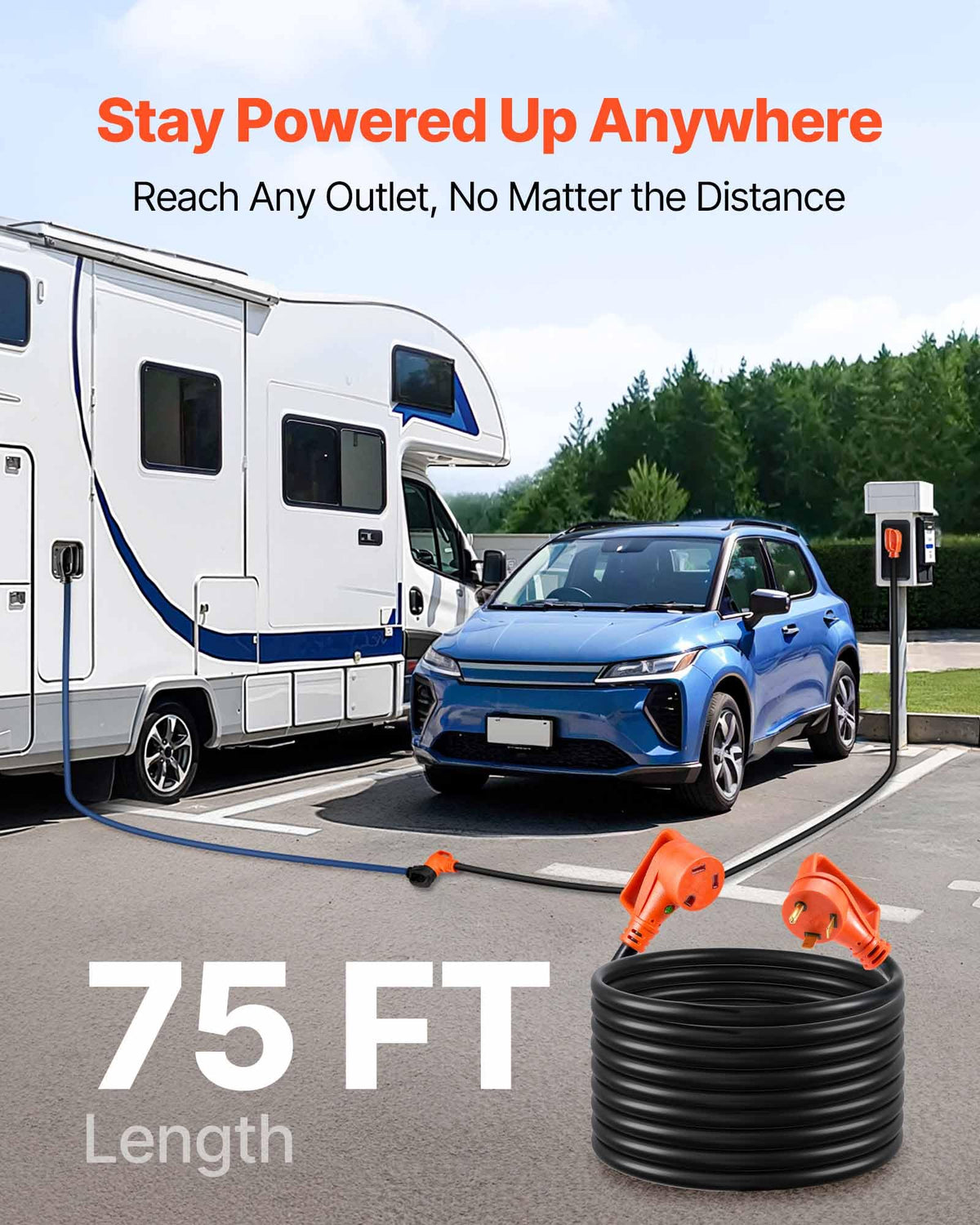 75 Ft Heavy-Duty Extension Cord: Ideal For Long-Distance Setups, Ensuring Your Rv Stays Powered Up Even When The Outlet Is Far Away. (Note: Power Loss Occurs For Cords Over 50 Ft, 30A May Drop To 20A Due To Increased Resistance) | 30A Pure Copper Wire: Built With Premium 10Awg Pure Copper Wire, This 3-Prong Nema Tt-30P To Nema Tt-30R Cord Supports Up To 2500W At 125V. Designed For High-Power Rv Appliances And Reliable Power Transfer On The Road | Tested To Etl Standards: With Stw Insulation Jacket, This Rv Extension Cord Is Ready For Rain, Heat, And Harsh Outdoor Conditions. It Delivers Reliable Power And Protection Whether Used Outdoors Or For Indoor Power Extension | User-Friendly Design: The Female End Features A Bright Led Power Indicator, Allowing Your To Confirm Power Status At A Glance. The Ergonomic Handle On The Male End Provides A Secure, Comfortable Grip, Making Plug And Unplug A Breeze | Tangle-Free Storage: Comes With An Adjustable Storage Strap With Handle, Keeping Your Cord Organized And Easy To Carry. No More Tangled Messes. Just Wrap, Strap, And Go