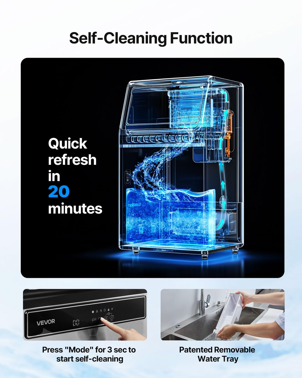 Efficient Ice Making: The Commercial Ice Maker Produces 45 Cubes Per Cycle And Up To 130 Lbs Of Ice Daily, With 33 Lbs Of Ice Storage. Ideal For Home, Bar, Or Light Commercial Use. Etl And Energy Star Certified For Secure And Efficient Performance | Easy Operation: This Ice Maker Machine Features Intuitive Led Controls, Just Select Thick Or Thin Cubes With One Touch. The Large Viewing Window And Blue Interior Lighting Let You Monitor The Ice-Making Process Without Opening The Lid | Easy To Clean: This Self-Cleaning Ice Maker Runs A 20-Minute Automatic Rinse Cycle With A 3-Second Press Of The