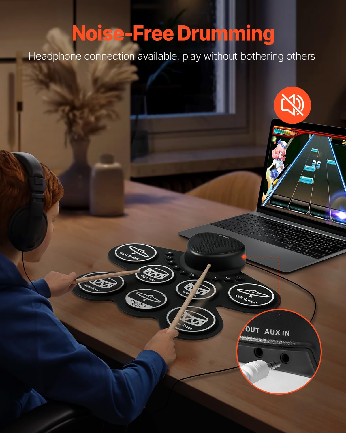 Vevor Electronic Drum Set, 7 Pads, Roll-Up Practice Drum Pad With Speaker, Headphone Jack, Portable Electric Drumset With Pedals