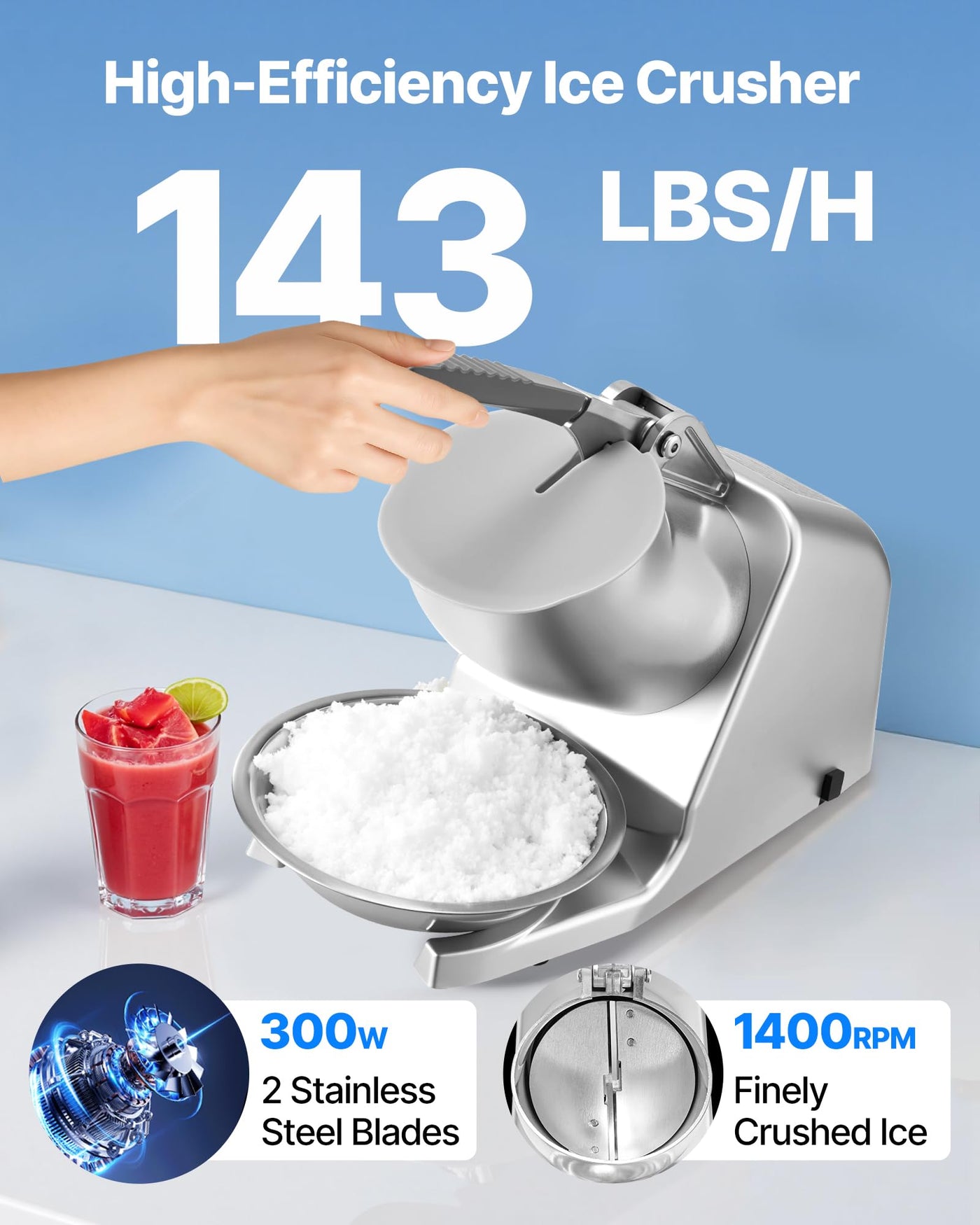 Vevor Ice Crusher Machine, 143Lbs Per Hour Electric 2 Blades Snow Cone Maker, Stainless Steel Shaved Ice Machine With Bowl And C