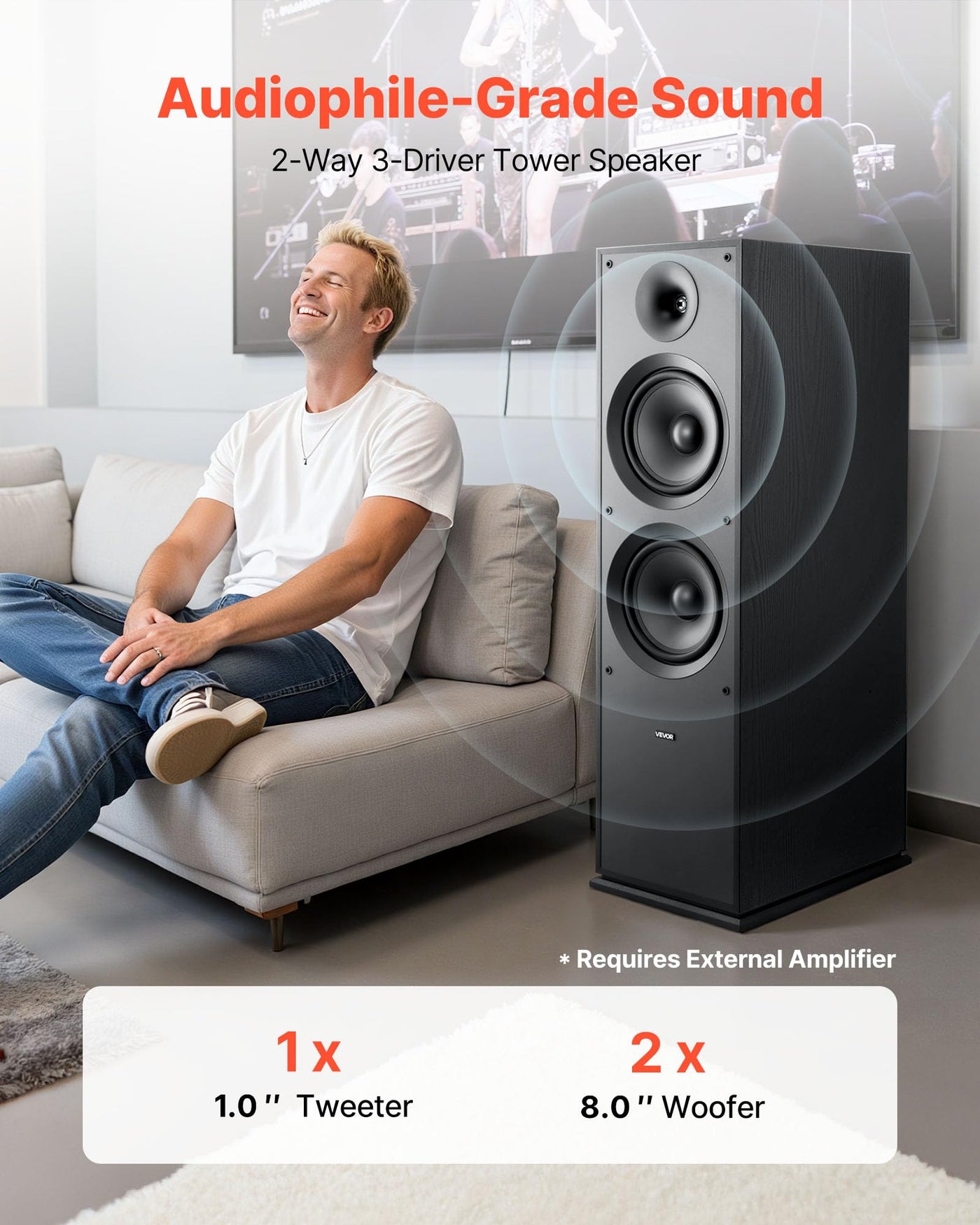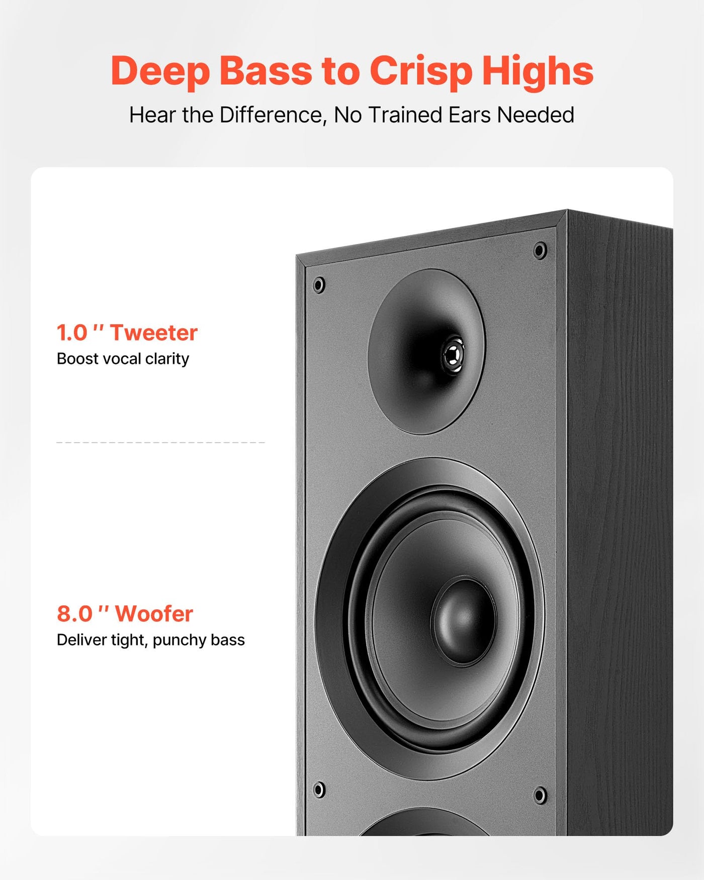 Clear 3-Way Sound: Our Floorstanding Speaker Features A 0.75 In Super Tweeter For Clear Highs, A 1 In Tweeter For Pure Vocals, And Dual 5.25 In Woofers For Punchy Bass. Accurate Three-Band (High/Mid/Low) Frequency Calibration, No Signal Interference