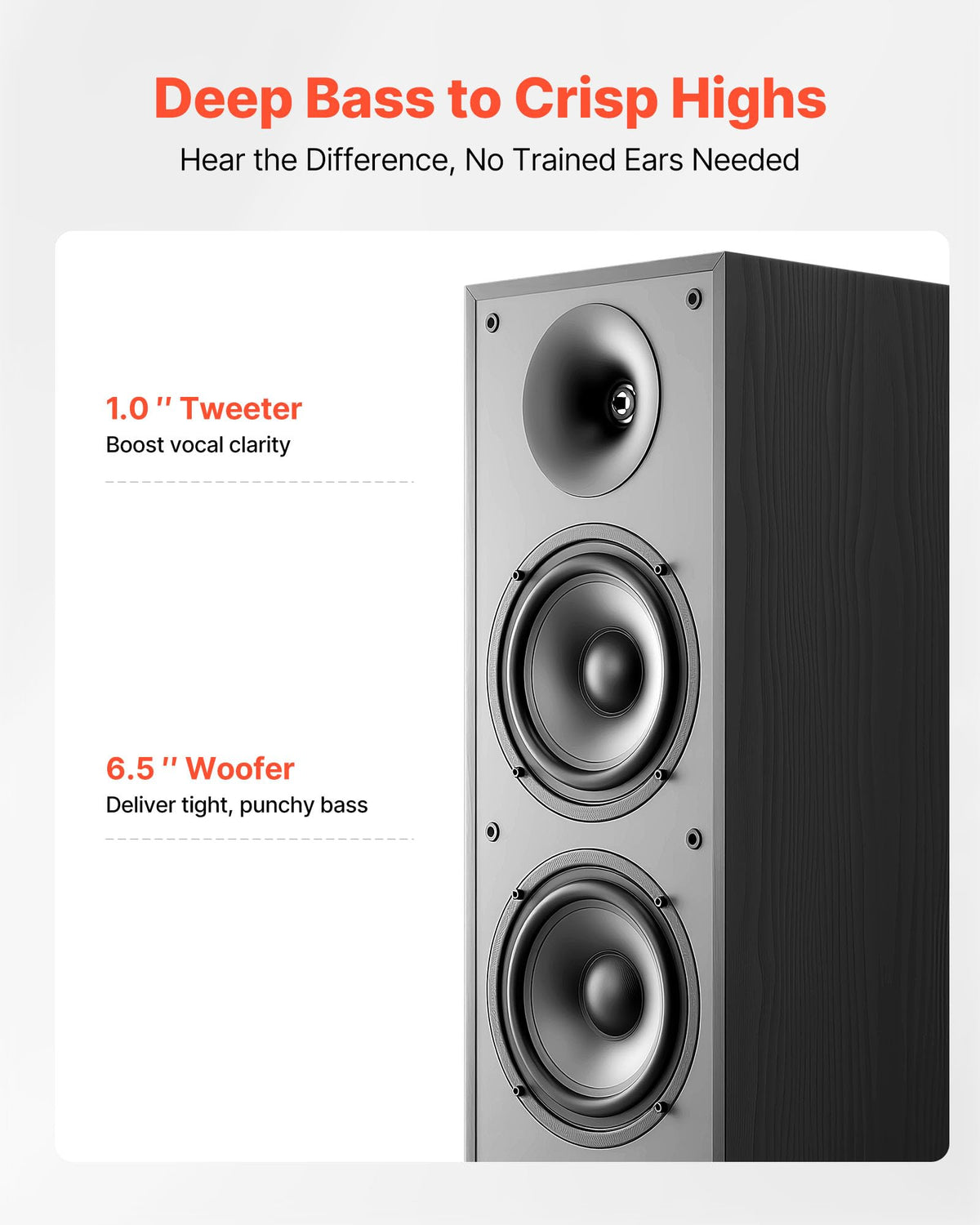 Clear 2-Way Sound: Our Floorstanding Speaker Features A 1 In Tweeter For Pure Vocals, And Dual 6.5 In Woofers For Powerful, Punchy Bass. Accurate Three-Band (High/Mid/Low) Frequency Calibration, No Spurious Signal Interference | Wide Frequency Range:With A 65Hz-20Khz Frequency Response, This Floorstanding Tower Speaker Delivers Stunning Detail From Punchy Low-End Beats To Soaring Violin Overtones | Withstand High-Impact Audio: Whether It