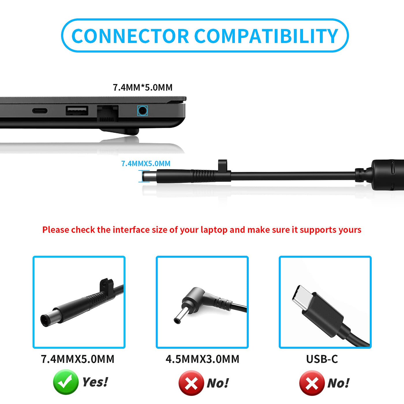 Q: What should I do if the adapter does not fit my laptop?A: If the VHBW adapter does not fit your laptop, please verify the connector size, which is 7.4mm x 5.0mm. Additionally, ensure that your laptop model is listed under the compatibility section. If issues persist, contact customer support for assistance.