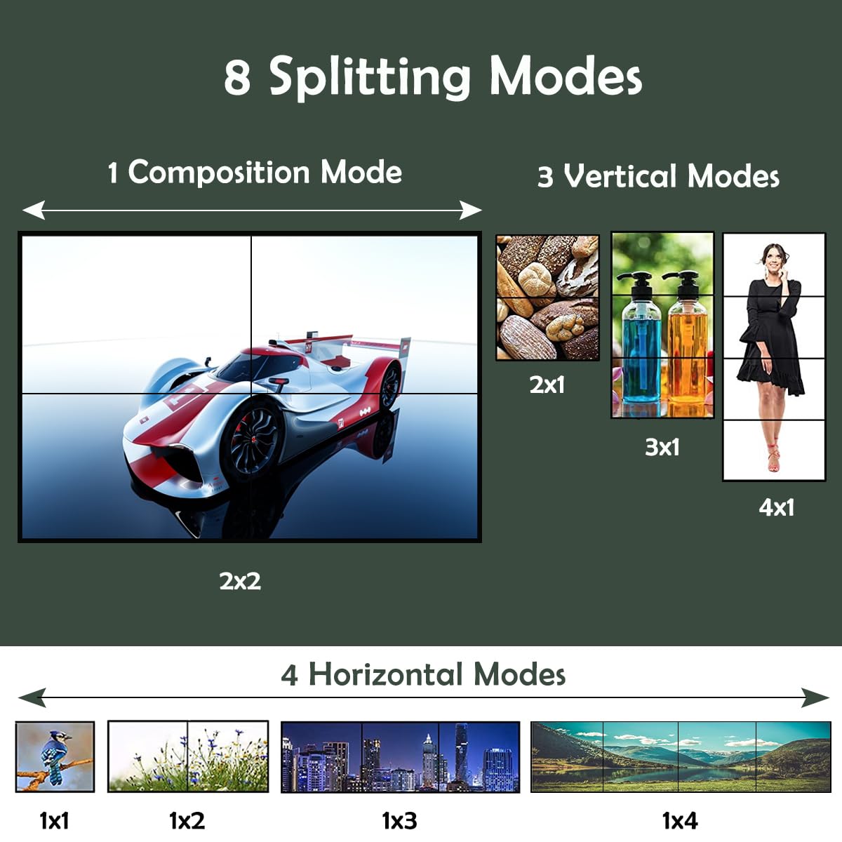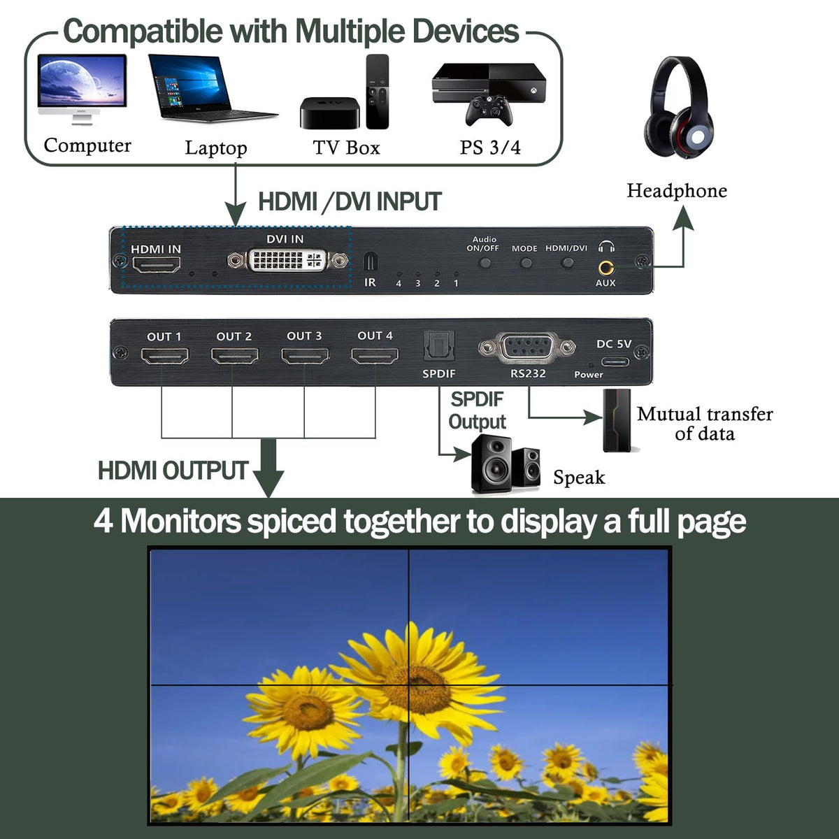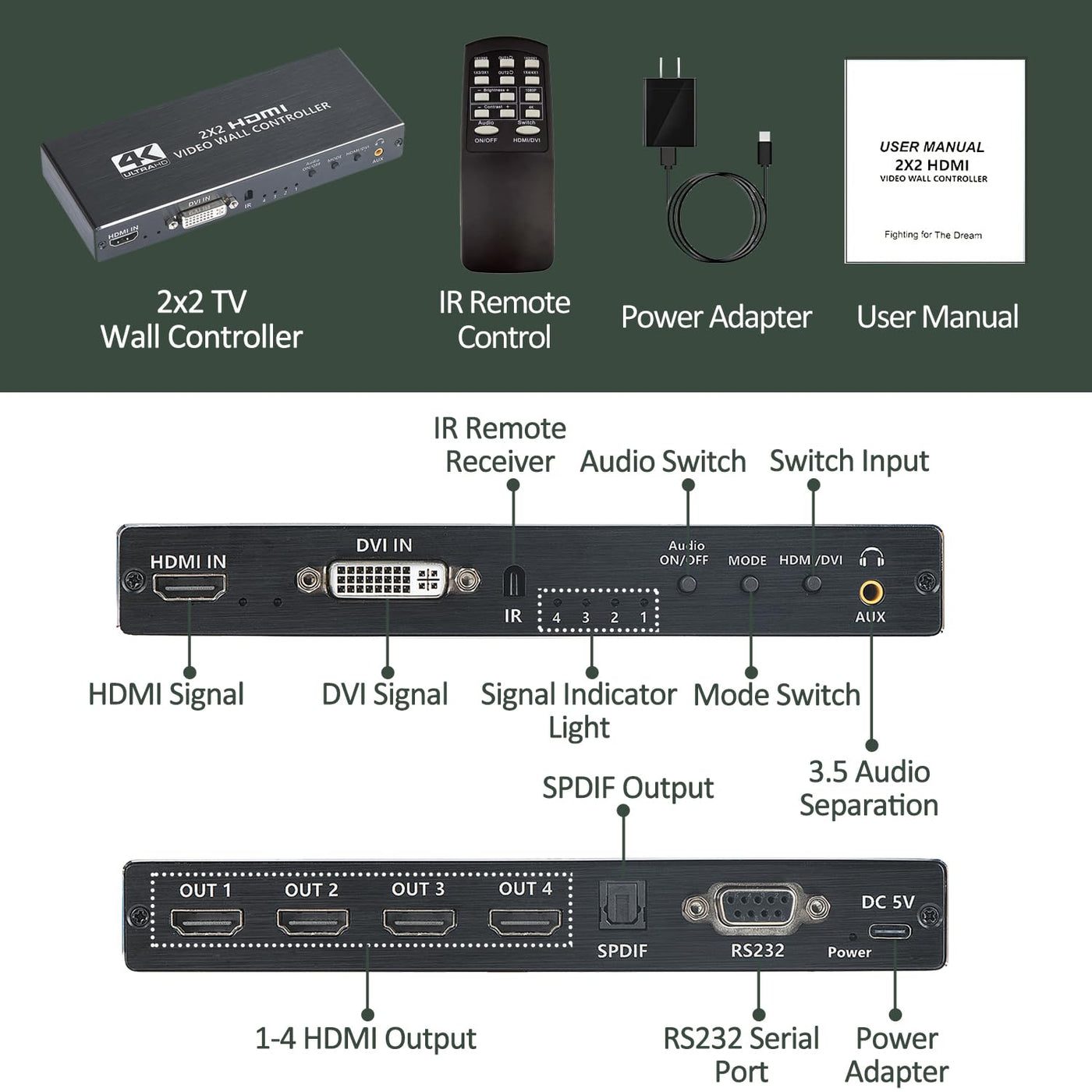 Video Wall Controller, 4K 2X2 Hdmi Dvi Tv Wall Processor, Support 180 Rotate, 4 Hdmi Output Support Images Stitching 1X2 1X3 1X4 4X1 Etc This Hd Video Wall Controller Supports Splicing Mode To Change, Four Hd Signal Output, Can Be Set To 2X2 Mode, Can Also Set 2X1, 3X1, 4X1, 1X2, 1X3, 1X4 And Other Modes. Specification Product Name: 2X2 Video Wall Controller Shell Material: Alloy Power Supply: 5V/ 2A. Input Support 1920X1080P 25/30/50/60Hz,3840X2160P 24/30Hz. Output Support 1920X1080P 60Hz Input Format: Rgb/Yuv24Bit; Output Format: Rgb444 24Bit. Support Four Hdmi Output, One 3.5Mm Stereo Output. Supports 5.1Ch Audio Output Over Optical Fibers. Supports Rs232; Supports Remote Control. Feature 1. Support 1 Hdmi Or Dvi Input And 4 Hdmi Outputs. 2. High-Definition Picture Presentation, Support 1080P High-Definition Picture Input And Output, Presenting A High-Definition, Vivid And Delicate Screenz. 3. No Need For Other Software Settings, Pure Hardware Devices, Simple Settings, Support To Modify The Stitching Mode Through The Button Switch, After The Stitching Mode Is Modified, The Device Needs To Be Powered Off To Restart The Device. 4. Gold-Plating Interface, Firm & Durable. Independent Chip Is Adopted To Ensure The Stable Performance Of The Device, With No Delay And Distortion. 5. The Case Is Made Of Metal With Multi-Hole Design, Better Anti-Interference, Corrosion- Resistant And Heat Dissipation Performance, To Ensure Its Longer Service Life. 6. Supports Splicing Mode To Change Freely, Plug And Play, Easy To Operate. Support For Splicing 2X2/ 2X1. Package Contents 1 * 2X2 Video Wall Controller 1 * 5V/ 2A Power Adapter 1 * Ir Remote Control 1 * User Manual