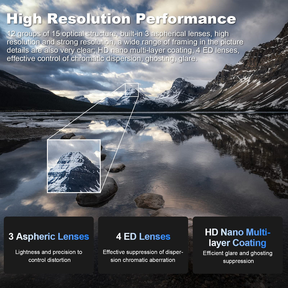 -16Mm Focal Length,F1.8 Large Aperture. -Optical Construction Of 15 Elements In 12 Groups,Including 4 Ed Lenses And 3 Aspheric Lenses. -Hd Nano Multilayer Coating With Water-Resistant And -Electronic Aperture,Internal Focus,Constant Lens Length. -Noiseless Stm Focus Motor. -Precision Metal Structure. Dust-Proof