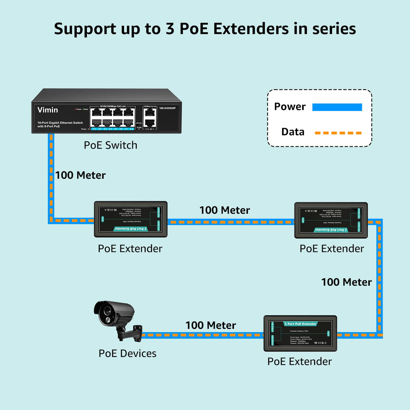 Q: How far can the VIMIN PoE Extender extend my network?A: The VIMIN 2-Port PoE Extender allows you to extend your network by an additional 100 meters (328 feet) for both power and data transmission, making it ideal for larger installations.