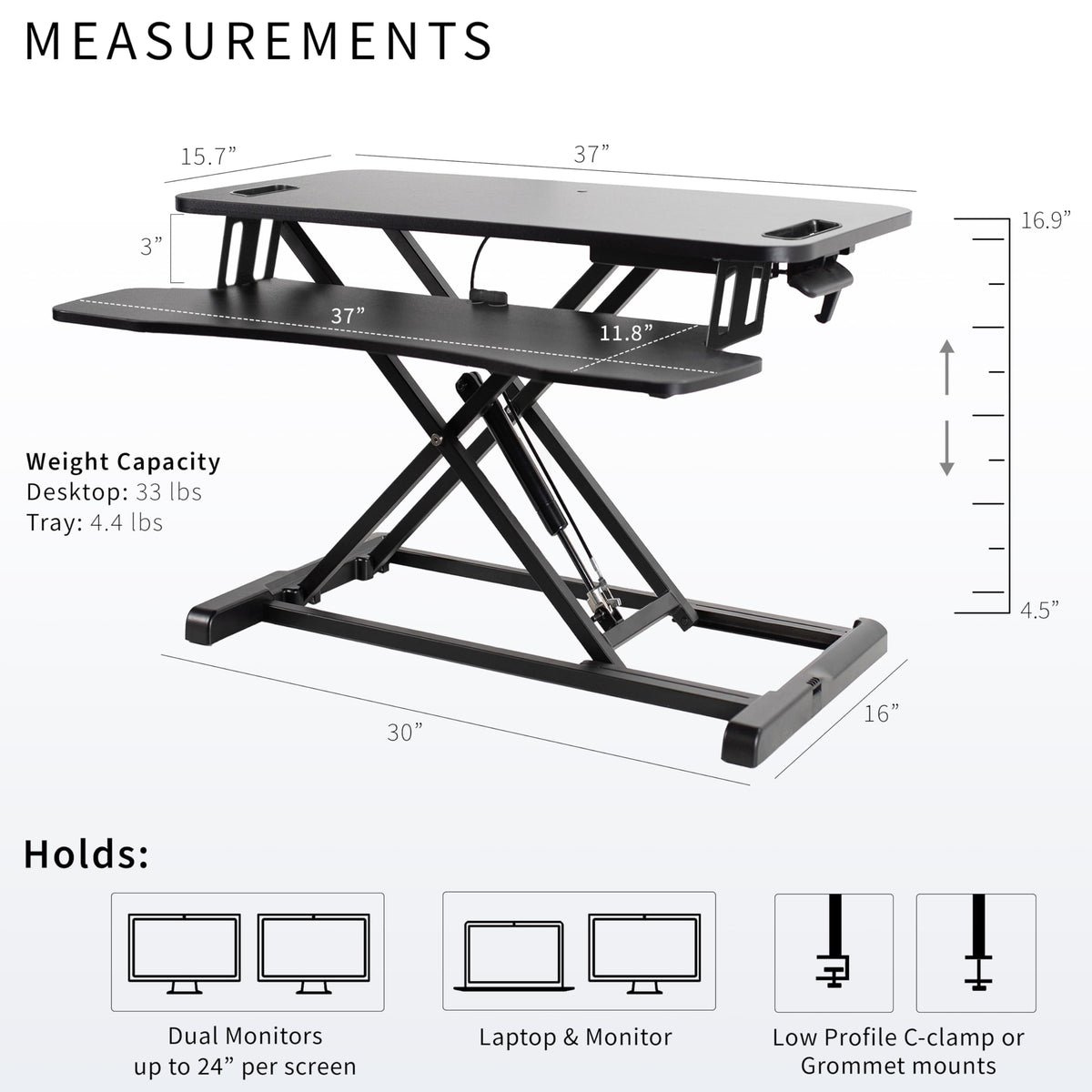 Enhance your work experience with White Desk Riser (DESK-V037KW) from VIVO! Transitioning between sitting and standing throughout the long work day provides numerous health benefits such as increased blood flow and reduced aches and pains. The solidly built desktop supports up to 33 lbs, easily holding multiple monitors or laptop and monitor combinations. It also features pneumatic spring lift that allows simple and smooth height adjustment at the squeeze of a handle. The dual tiered design lets you customize your work area to create the workflow you need, and the keyboard tray is removable using the provided hex tool. All necessary hardware and instructions are provided so you can get your new desk riser assembled in no time!