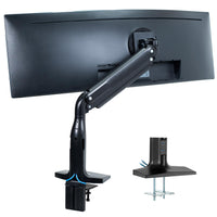 Save desk space and enjoy comfortable viewing angles with the Pneumatic Arm Single Ultra Wide Monitor Desk Mount with USB (STAND-V100HU) from VIVO! This dependable mount features adjustable tension, height, and articulation to help you find the ideal viewing angles, as well as integrated cable management for organization and USB ports to keep your devices fully charged. Sleek aluminum construction and a sturdy C-clamp/grommet base support up to 39.6 lbs in weight and keep your monitor safe and secure. All hardware and instructions are provided so you can get your new stand assembled in no time!