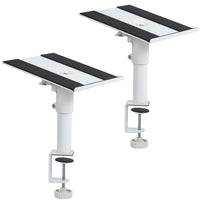 Elevate your speakers with the White Clamp-on Speaker Stands (MOUNT-SP01CW) from VIVO! These solid steel studio mounts are designed to easily clamp onto your desktop, providing an elevated platform for your speakers or surround sound system. Adjustable height settings create the perfect position for your setup, raising your speakers for greater sound clarity. The heavy-duty platforms provide a universal fit for most speakers, fully equipped with EVA foam padding to protect against scratches and help eliminate unwanted vibrations from amplified bass. Take your studio setup to the next level with these modern speaker mounts!