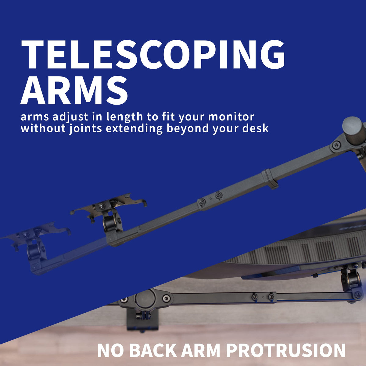 Enjoy a truly flush desk setup with the Telescoping Dual Monitor Desk Mount (STAND-V002E) from VIVO! Premium telescoping arms adjust in length to fit your monitors, accommodating 21� to 32� screens with ease. The adaptable nature allows for a snug side-by-side monitor positioning without fear of arms extending beyond the bounds of your desk, creating a setup that�s flush with the wall. The heavy-duty arms overlap and feature fewer joints than typical mounts which creates a stronger, more durable hold for your monitors. Additional features include sleek cable management for an organized appearance, screen articulation for ergonomic viewing angles, and height adjustment for customized placement. All hardware and instructions are provided so you can get your new stand assembled in no time!